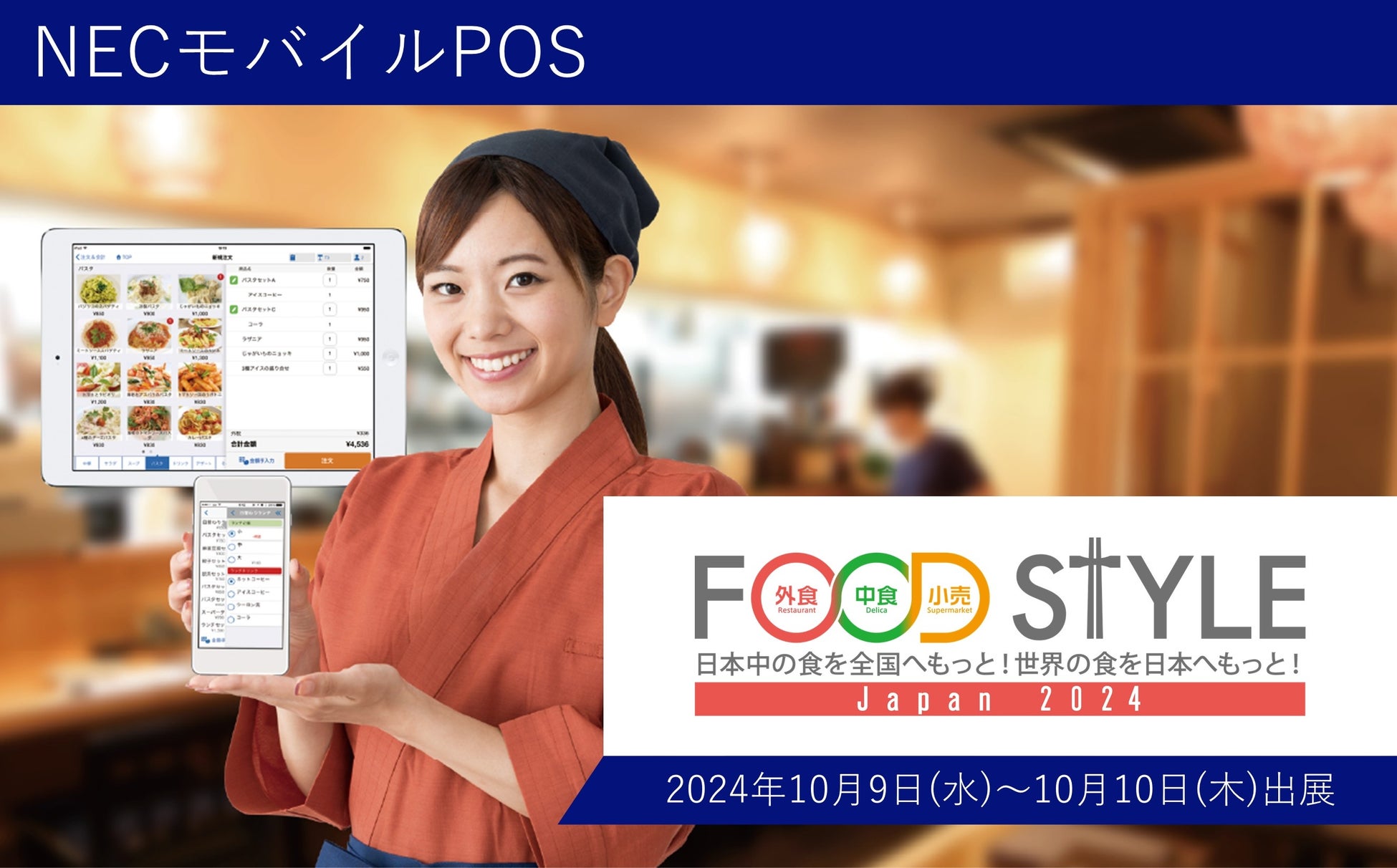 日本電気株式会社(本社:東京都港区、取締役 代表執行役社長 兼 CEO:森田 隆之、以下NEC)は、2024年10月9日(水) ~ 10月9日(木)まで開催される「FOOD STYLE Japan 2024」(主催:株式会社イノベント)にサブスクリプション型POSシステム「NECモバイルPOS」を出展します。