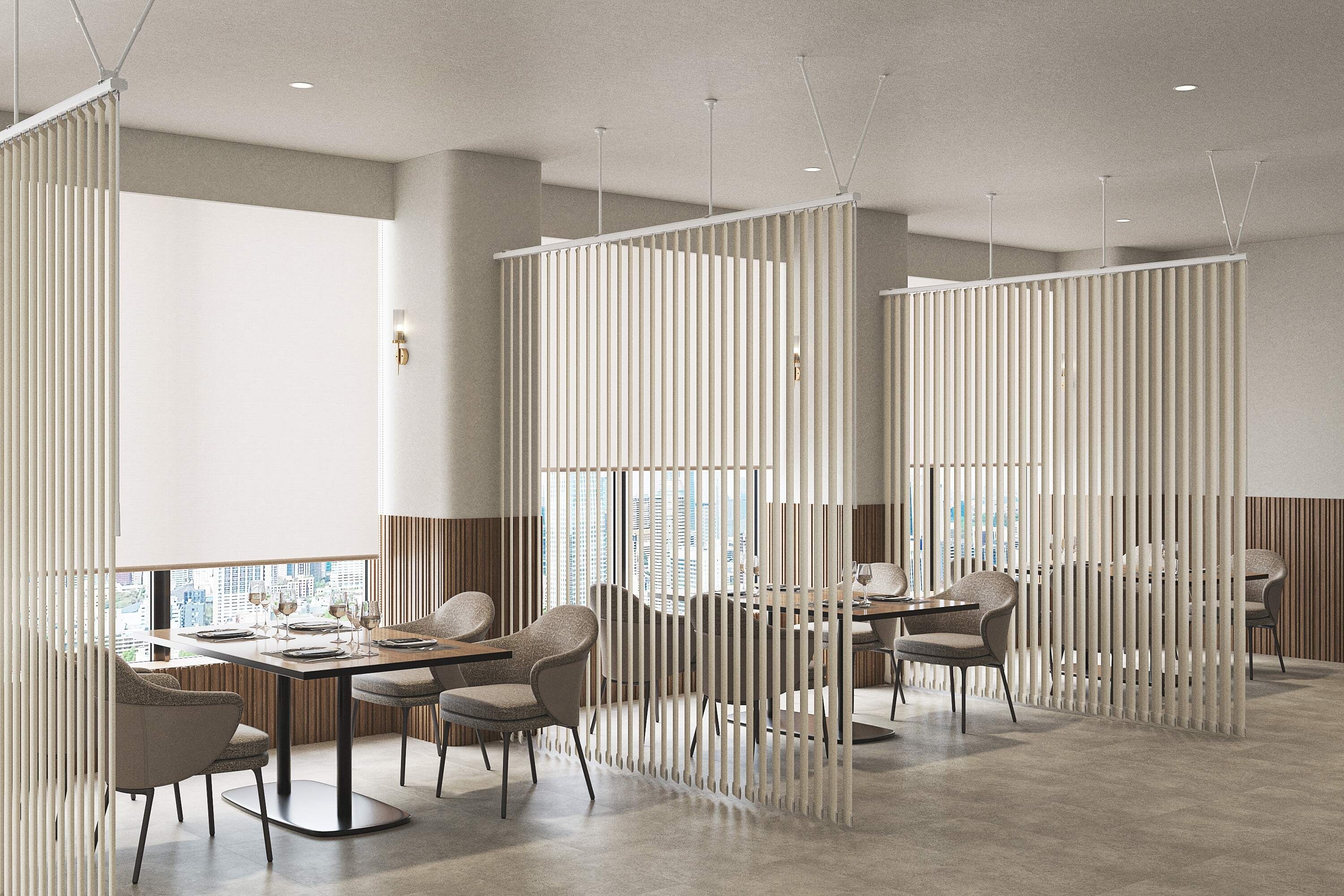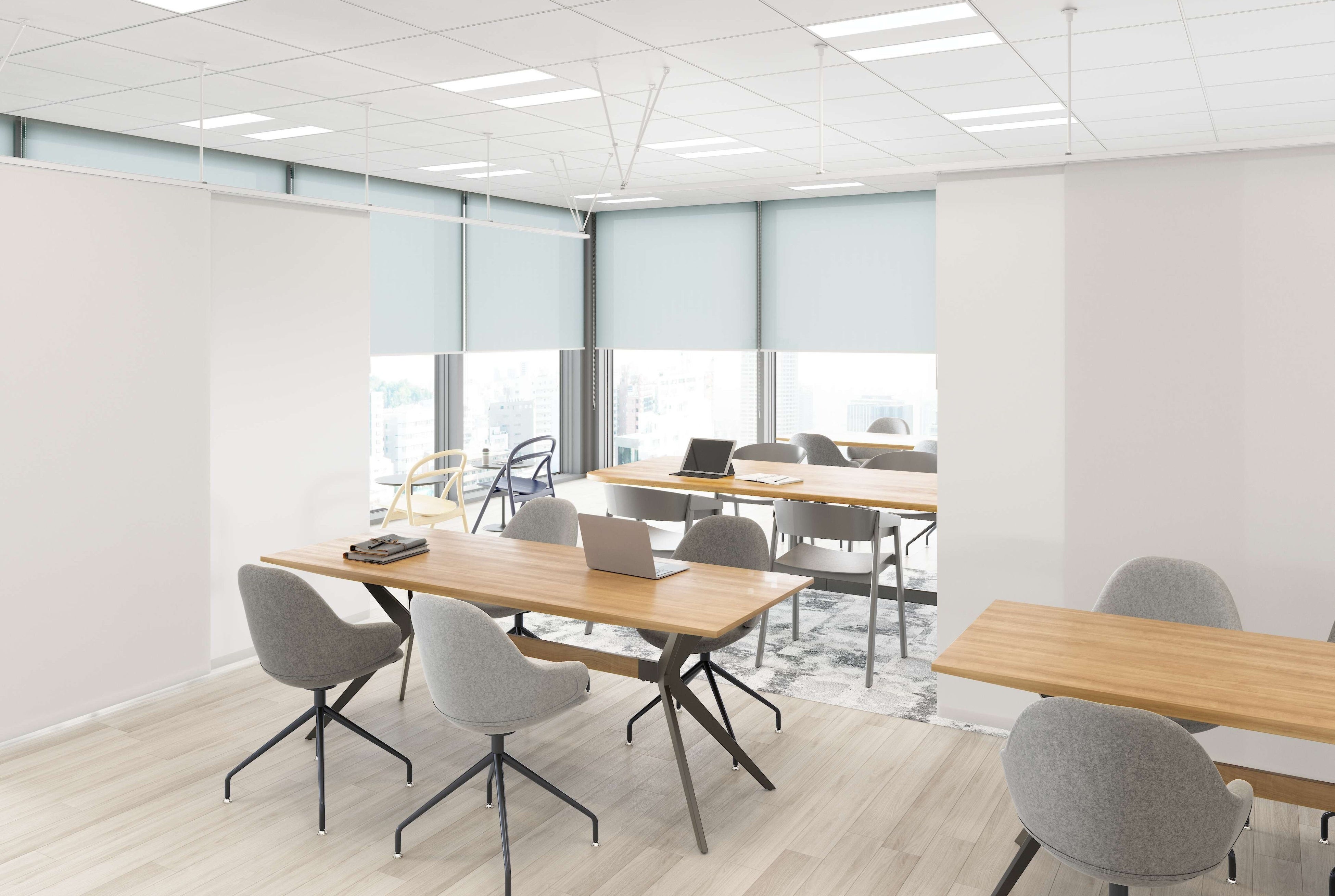 吊棒にファブリック製品を取り付けることで、間仕切りとしての活用が可能です。オフィスではゾーニング用途として空間を緩やかに区切り、医療施設やサロンでは視線を遮る目隠しとして、また店舗では空間を区分する仕切りとして活用できます。ロールスクリーン「ラルクシールド」、調光タテ型ブラインド「エアレ」、タテ型ブラインド「ラインドレープ」、パネルスクリ―ンなどに対応しており、用途や空間に応じた選択ができます。また、調光や昇降機能を備えた製品を選択することで、採光や視線の調整が可能となり、利用シーンに応じた空間演出に対応します。ファブリック製品ならではの豊富な生地ラインナップで、空間デザインに応じた選択が可能です。
