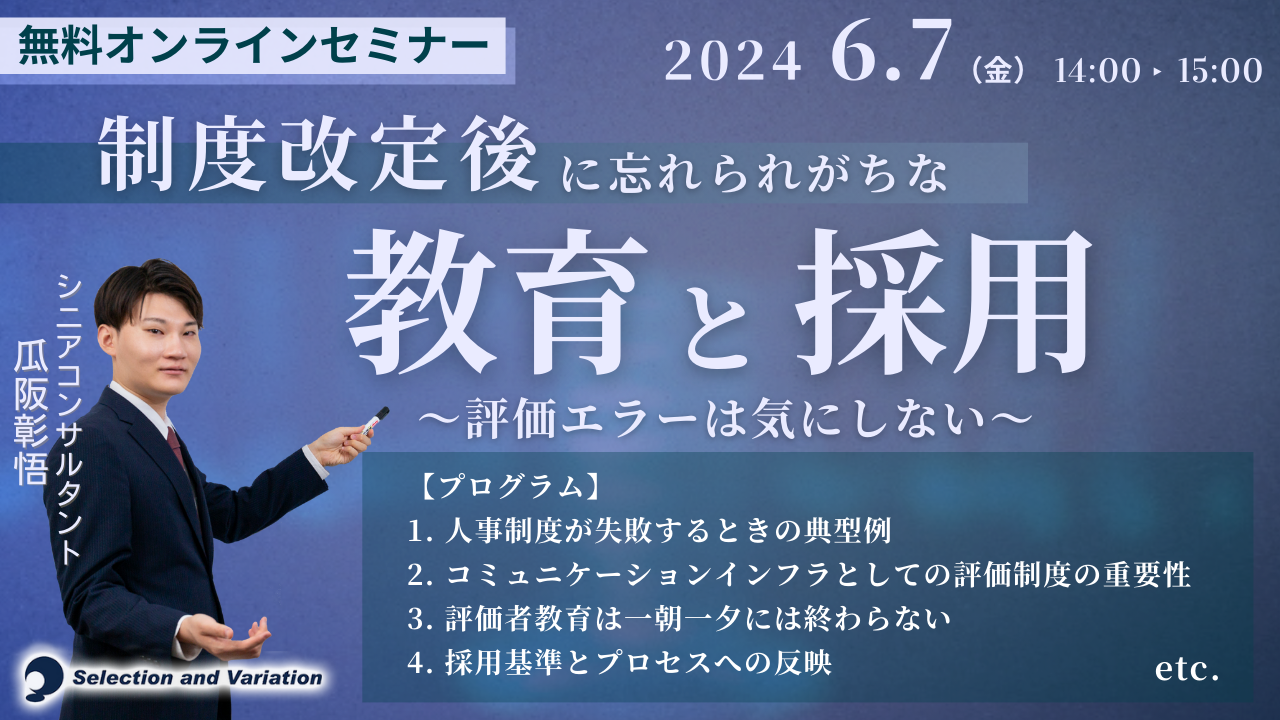 「制度改定後に忘れられがちな教育と採用~評価エラーは気にしない~」セミナー【6月7日 14:00〜15:00】