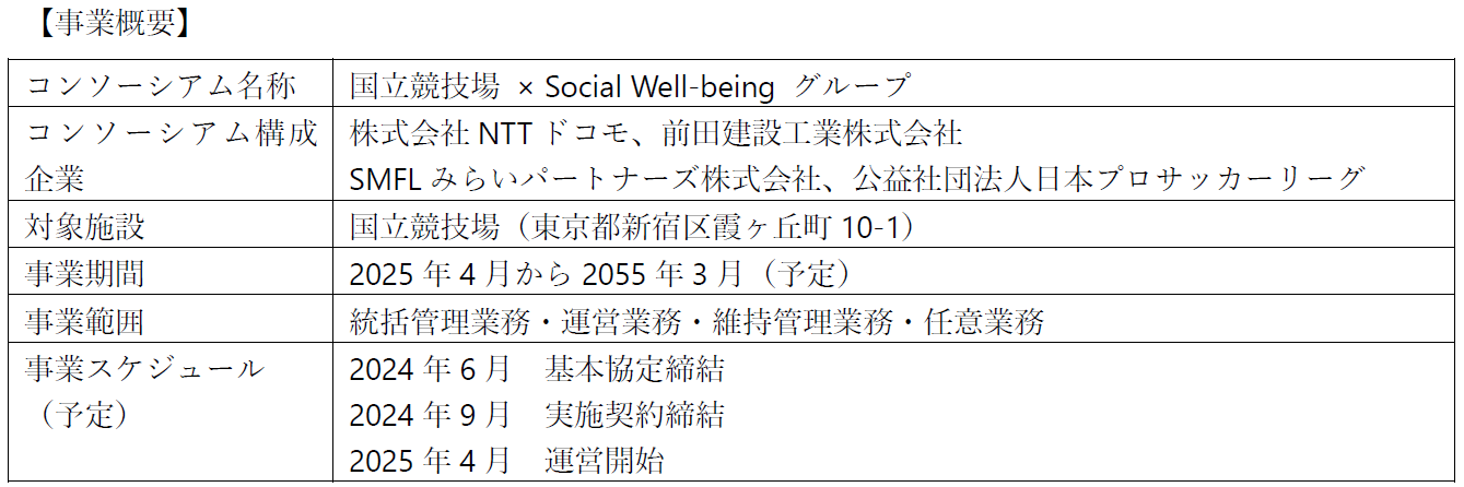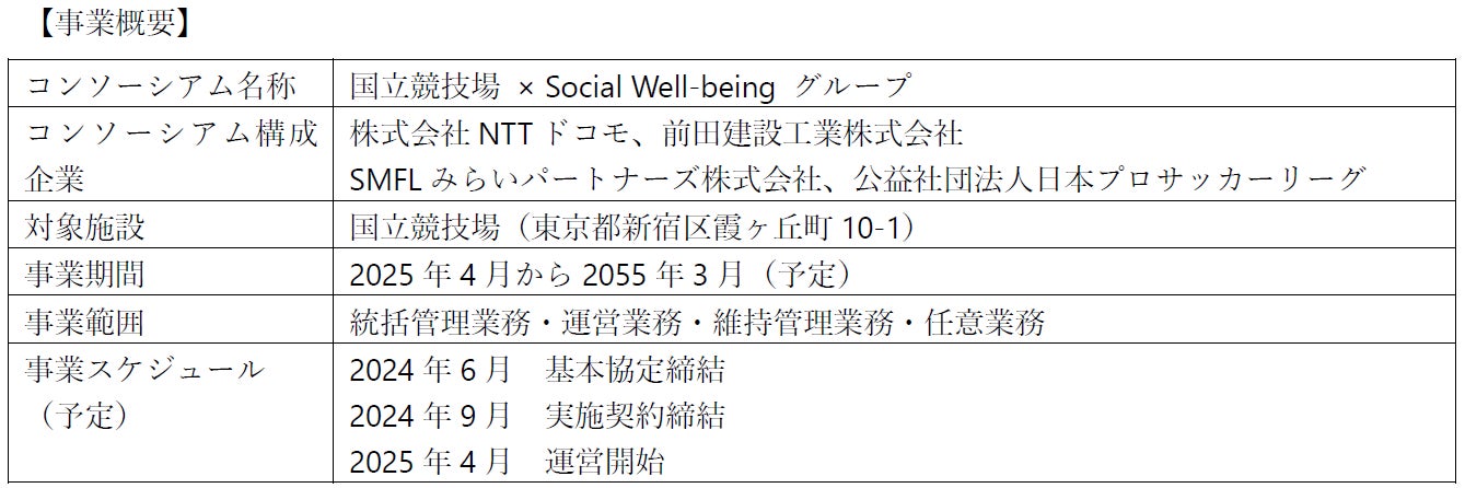 本事業は、「国立競技場をスポーツ振興の中核拠点として運営するとともに、日々人々が集まり長く愛されるスタジアムとすることを目指し、民間事業者のノウハウと創意工夫を活用した効率的な運営や利用促進による収益拡大などを図ることにより、国民の利益につなげること」を目的としています。本コンソーシアムは3つの「CHANGE」を事業ビジョンに掲げた運営を通じて、国立競技場を起点として生まれる人と人とのつながりによる幸福「Social Well-being」の実現を目指します。