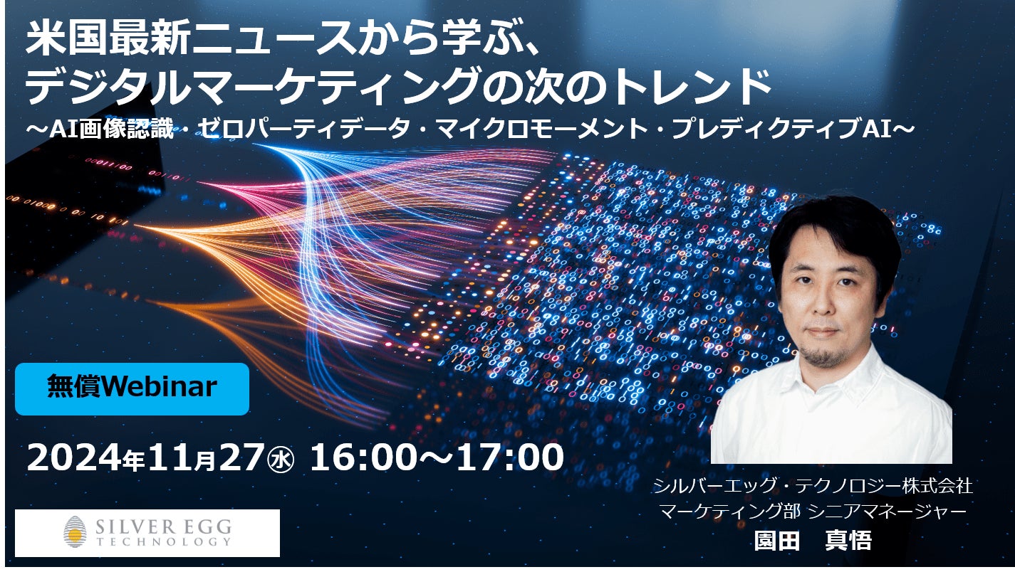 AI技術をベースとしたデジタルマーケティングサービスを提供するシルバーエッグ・テクノロジー株式会社(本社:大阪府吹田市、代表取締役社長&CEO:トーマス・フォーリー、証券コード 3961、以下 当社)は、2024年11月27日(水)にウェビナー「米国最新ニュースから学ぶ、デジタルマーケティングの次のトレンド~AI画像認識・ゼロパーティデータ・マイクロモーメント・プレディクティブAI~」を開催いたします。
