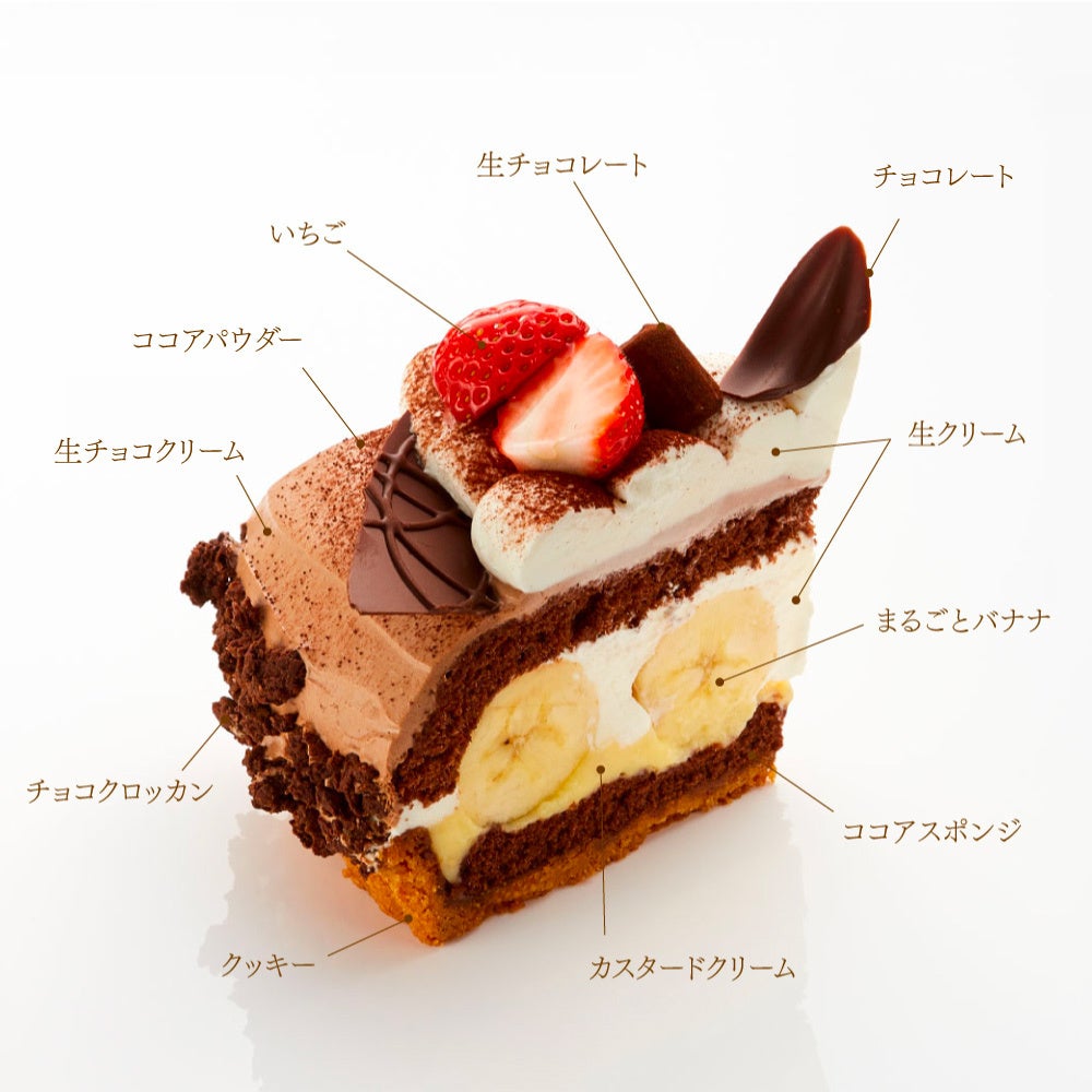 軽い口当たりの生チョコクリームと香り豊かなココアスポンジ、バナナの相性がたまらないロングセラーケーキです。