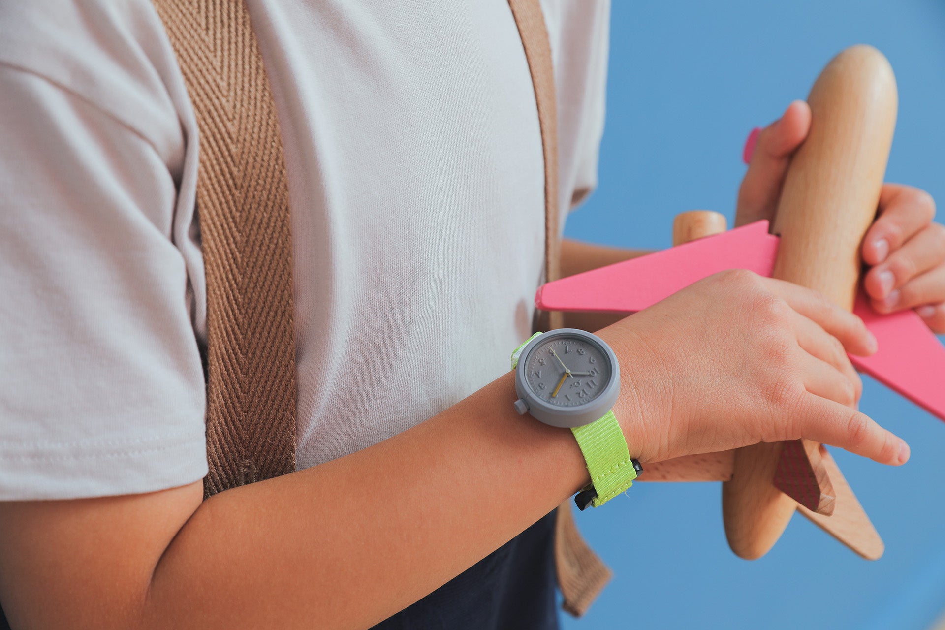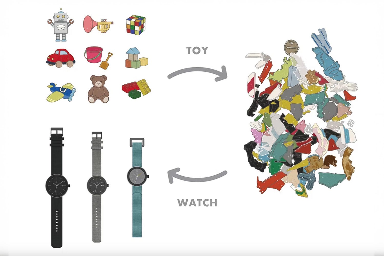 YOT WATCHは、子どもたちが使っていたプラスチックのおもちゃを回収・リサイクルして作られた腕時計。