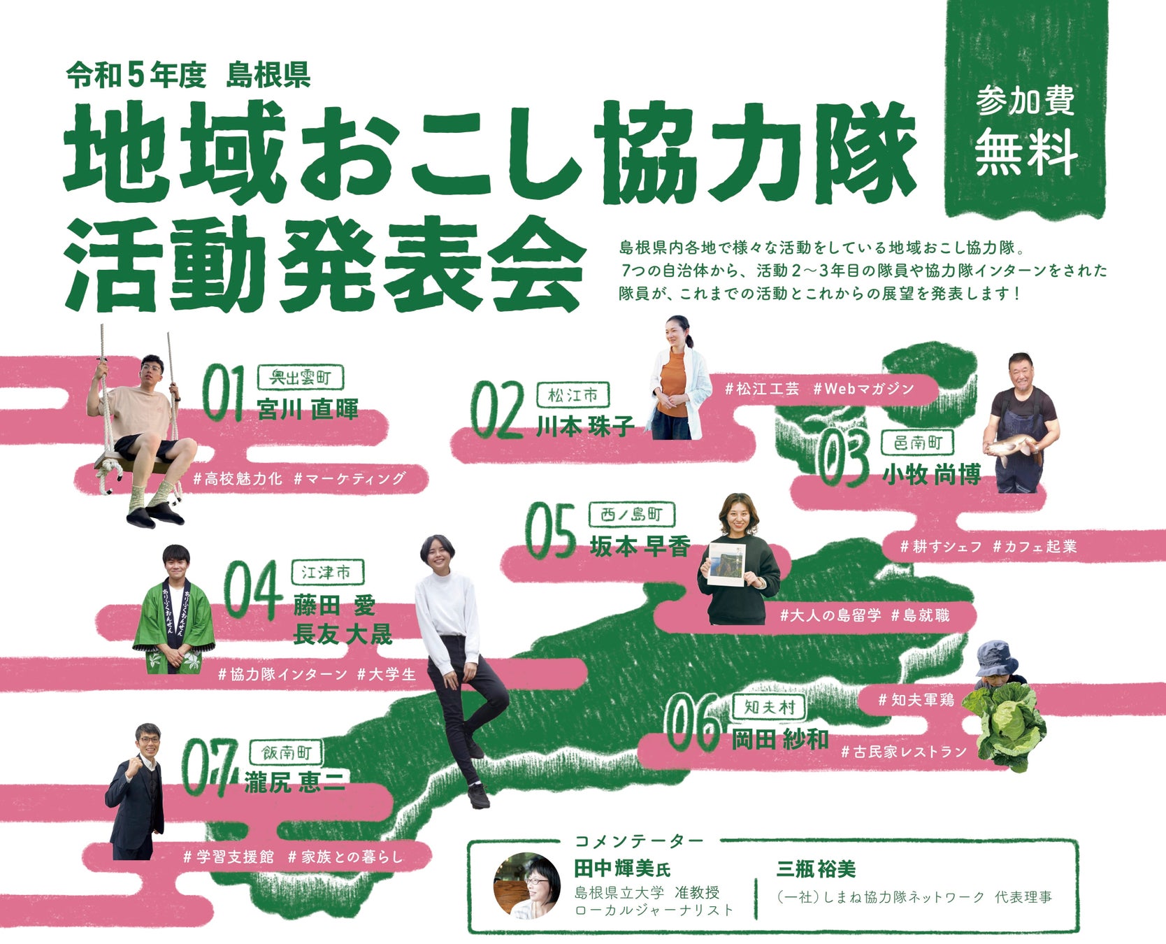 本イベントは公益財団法人ふるさと島根定住財団が主催し、本学西嶋一泰研究室が共催、島根県の地域おこし協力隊OBOGが組織した一般社団法人しまね協力隊ネットワークが運営します。