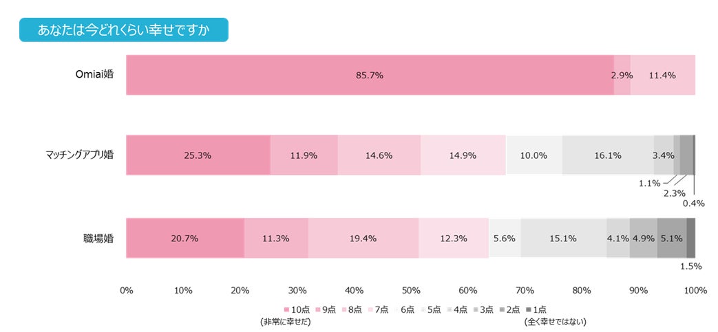 現状の幸せ点数が10点(非常に幸せだ)と回答した方は、Omiai婚が職場婚の4倍以上という結果に!職場婚とマッチングアプリ婚ではややマッチングアプリ婚が上回る
