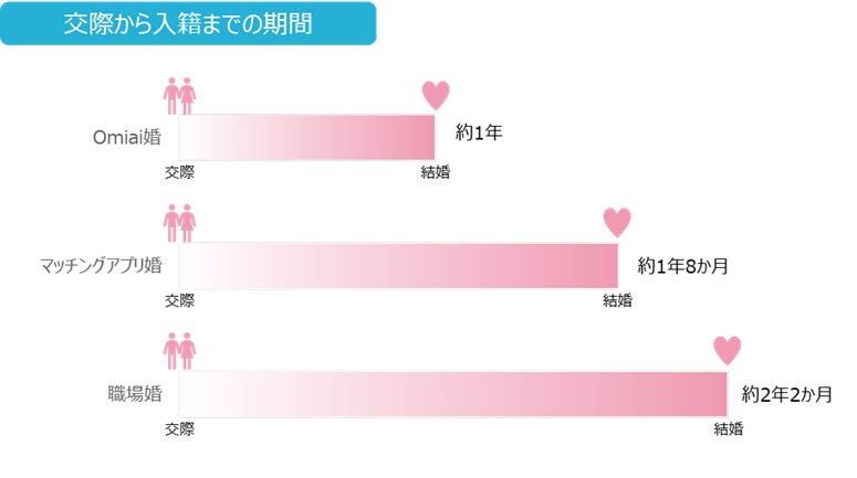 交際から結婚までの期間の平均を比較すると、職場婚の2年2か月に対し、マッチングアプリ婚では約1年8か月で約1.2倍早く、Omiai婚では1年とさらに2.2倍早いことが判明しました。Omiaiは結婚を見据えた出会いを求めて登録される方が9割を超える婚活マッチングアプリですが(※2)、登録目的に偽りなく結婚に至るスピードがより速いことが分かりました。