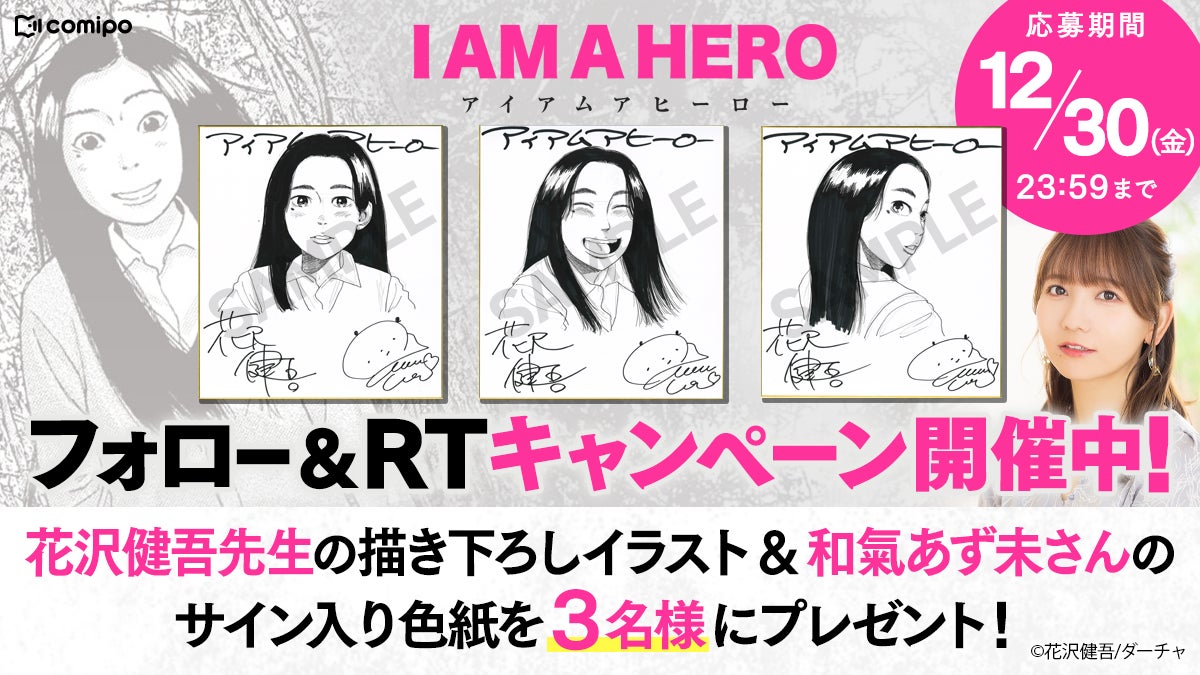 ボイスコミック『アイアムアヒーロー 完全版』の配信開始を記念して、comipoの公式Twitterアカウント https://twitter.com/app_comipo において、作者である花沢健吾先生の直筆イラストと和氣あず未さんのサインが入った色紙が3名様に当たるTwitterキャンペーンを開催いたします。