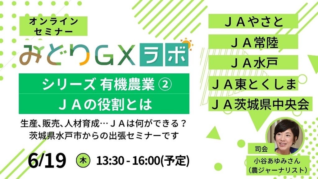 6月19日(木)には、「シリーズ有機農業」の第2弾として、「JAの役割とは」をテーマとしたセミナーを開きます。有機農業を巡っては、地元自治体との連携や販路の確保、生産者の育成・指導など、JAが果たす役割が注目されています。本セミナーは、JAグループが率先して有機農業に取り組む茨城県から、みどりGXラボ初の出張セミナーとして配信。茨城県内の3JA(やさと、常陸、水戸)と、徳島県のJA東とくしまを迎え、JAが有機農業に関わる意義や、具体的な取り組み方を聞きます。
