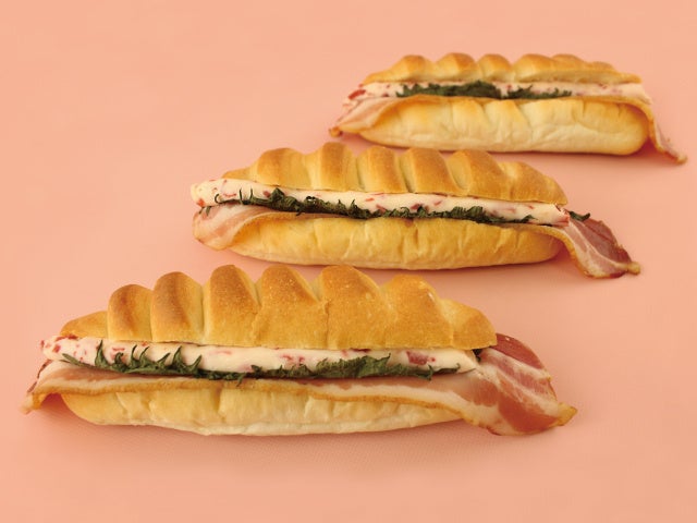 ソフトな生地に乾塩ベーコンとカリカリ梅とクリームチーズを合わせたフィリング、大葉をサンドしました。