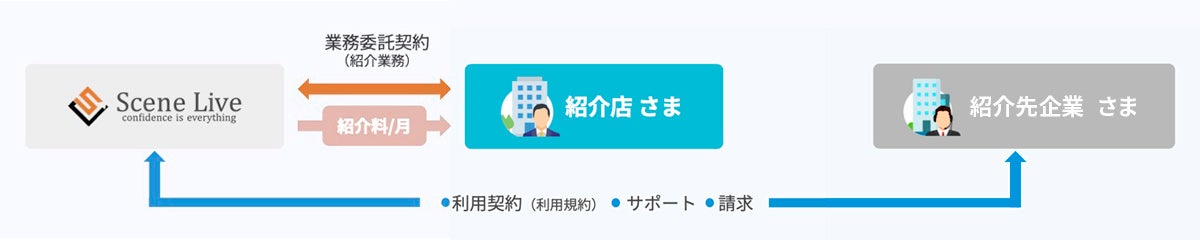 Scene Liveに企業さまをご紹介いただき、紹介先企業さまが対象のサービスを導入された場合に、紹介料をお支払いする制度です。