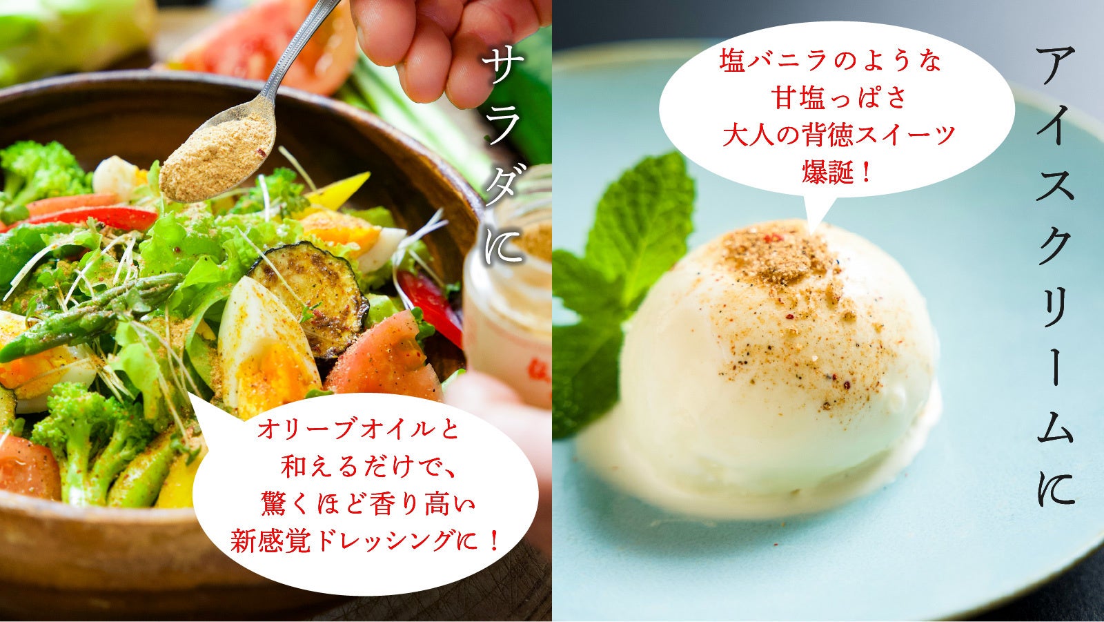 また、サラダやアイスクリームにかけたり・・・食卓に、新しいアクセントを加えるそんなスパイス塩です。