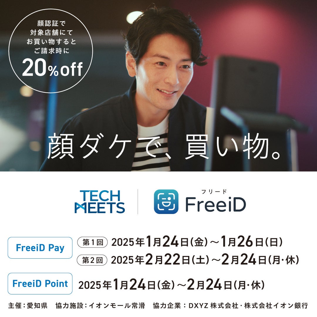 愛知県が主催するあいちデジタルアイランドプロジェクト『TECH MEETS』にて、ニーズ企業・施設として参画した、イオンモール常滑と株式会社イオン銀行(本社:東京都千代田区、代表取締役社長:木坂有朗、以下「イオン銀行」)と、シーズ企業として採択※1されたDXYZ株式会社(本社:東京都新宿区、取締役社長:木村晋太郎、以下「DXYZ」)は、DXYZの顔認証IDプラットフォームFreeiDを活用した「顔ダケで、買い物。」実証事業を2025年1月24日(金)より開始することをお知らせします。