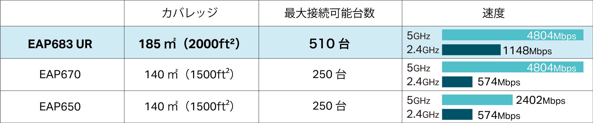“UR”=ULTRA RANGEは、カバレッジを向上させたモデルであるとともに、従来のWi-Fi 6アクセスポイント(EAP670やEAP650など)と比べて同時接続可能台数*1が増えたことにより、Wi-Fi環境でのストレスを軽減し、拡張性・柔軟性に優れたWi-Fi環境の構築が可能です。