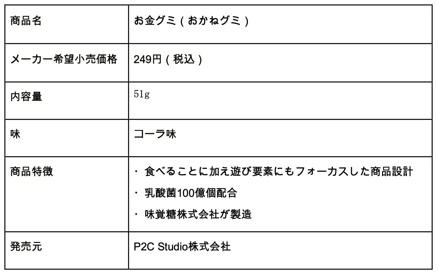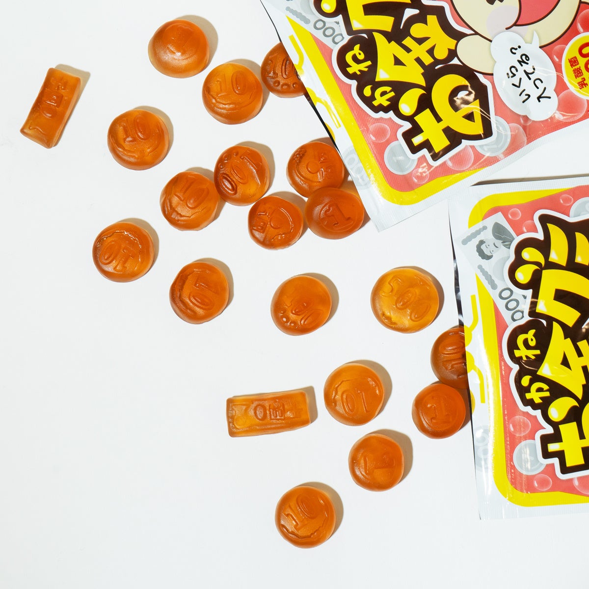 第4弾商品は、コーラ味の「お金グミ」。パッケージをお財布に見立て、お金の形をしたグミ6種類(1円、5円、10円、100円、500円、1,000円に見立てた形)がランダムに入っています。袋ごとに入っているグミの種類・合計金額が異なるため、友達と一緒に買って合計金額を競ったり、お金の価値や計算することの大切さを学ぶことができる、遊び心の詰まったグミです。