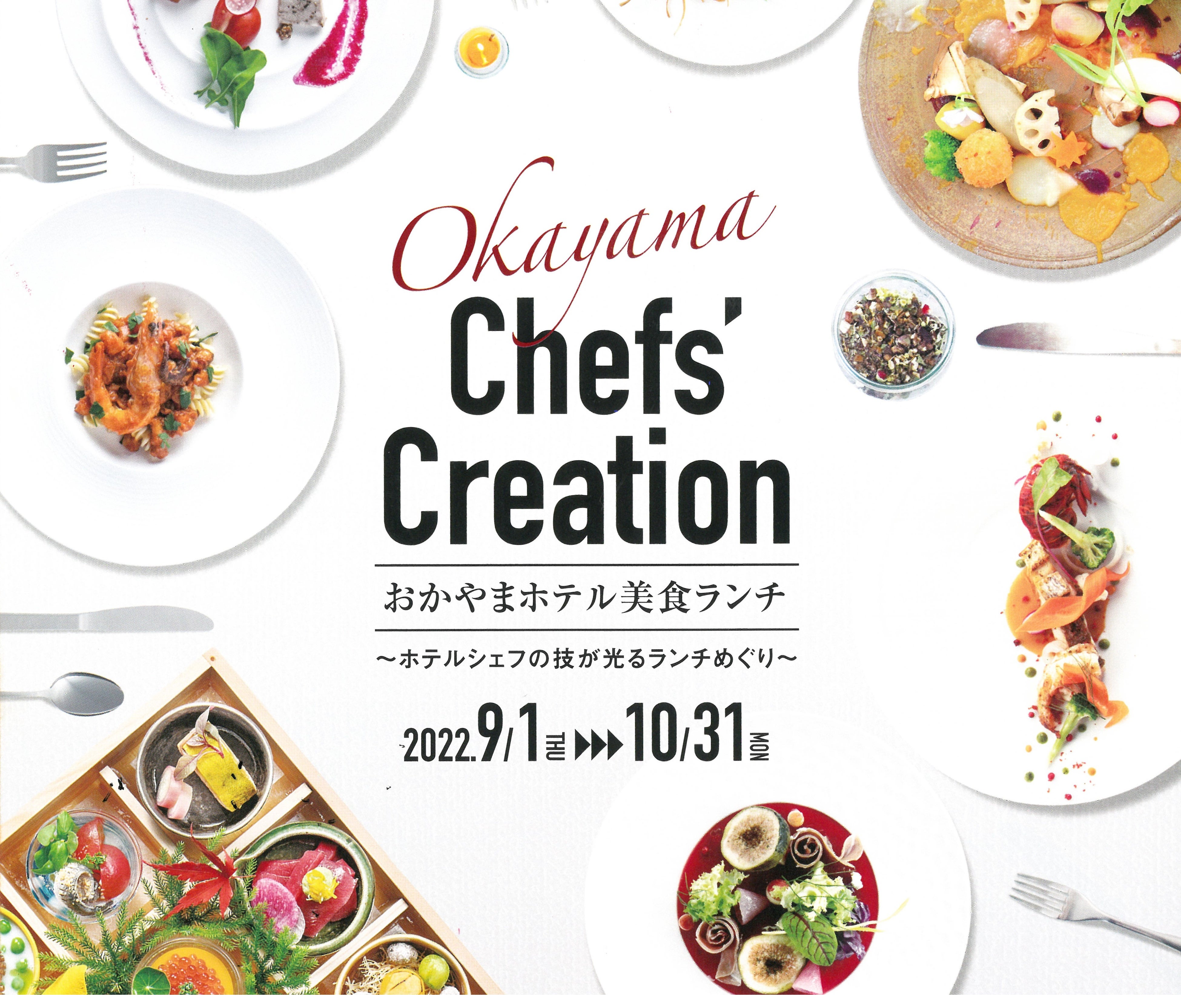 この企画は、岡山・倉敷を代表する4つのホテルのシェフが、毎年掲げるテーマに沿ってランチメニューを提供するもので、今回で13回目となります。今年のテーマは「美食」。美味しさは勿論のこと、見た目もアートのように美しい料理を多くのお客様に召し上がっていただきたいと、各ホテルのシェフ達が腕を振るいメニューを考案いたしました。