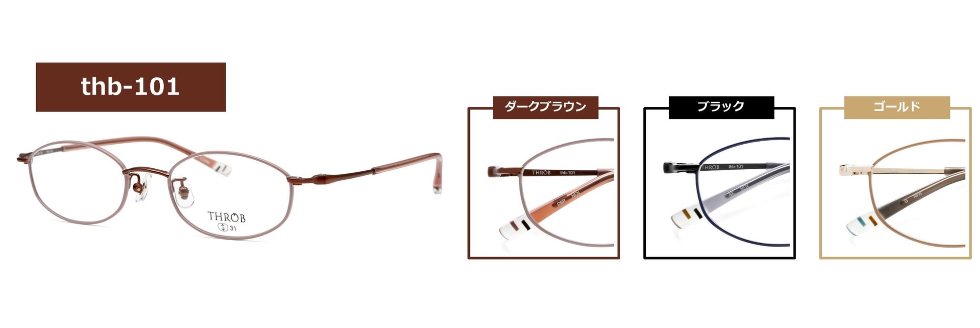 目元をすっきりと見せるシャープなオーバルシェイプ。レトロな雰囲気のリムカラーとブリッジ・ヨロイのメタリックな輝きが大人の美しさを演出します。カラーはダークブラウン、ブラック、ゴールドの3色です。
