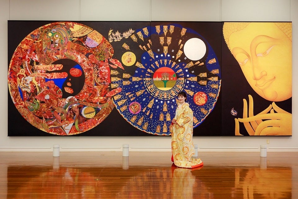 衣装は日本の伝統的な白無垢や色打掛で。幸せな新郎新婦の後ろには、現在、現代タイを代表する画家、パンヤー・ウィチンタナサーンの巨大な作品「魂の旅 The Journey of Soul」が展示されています。挙式後は、「福岡アジア美術館」の展示ギャラリー(常設スペース)でのフォトセッションを行うことができます。