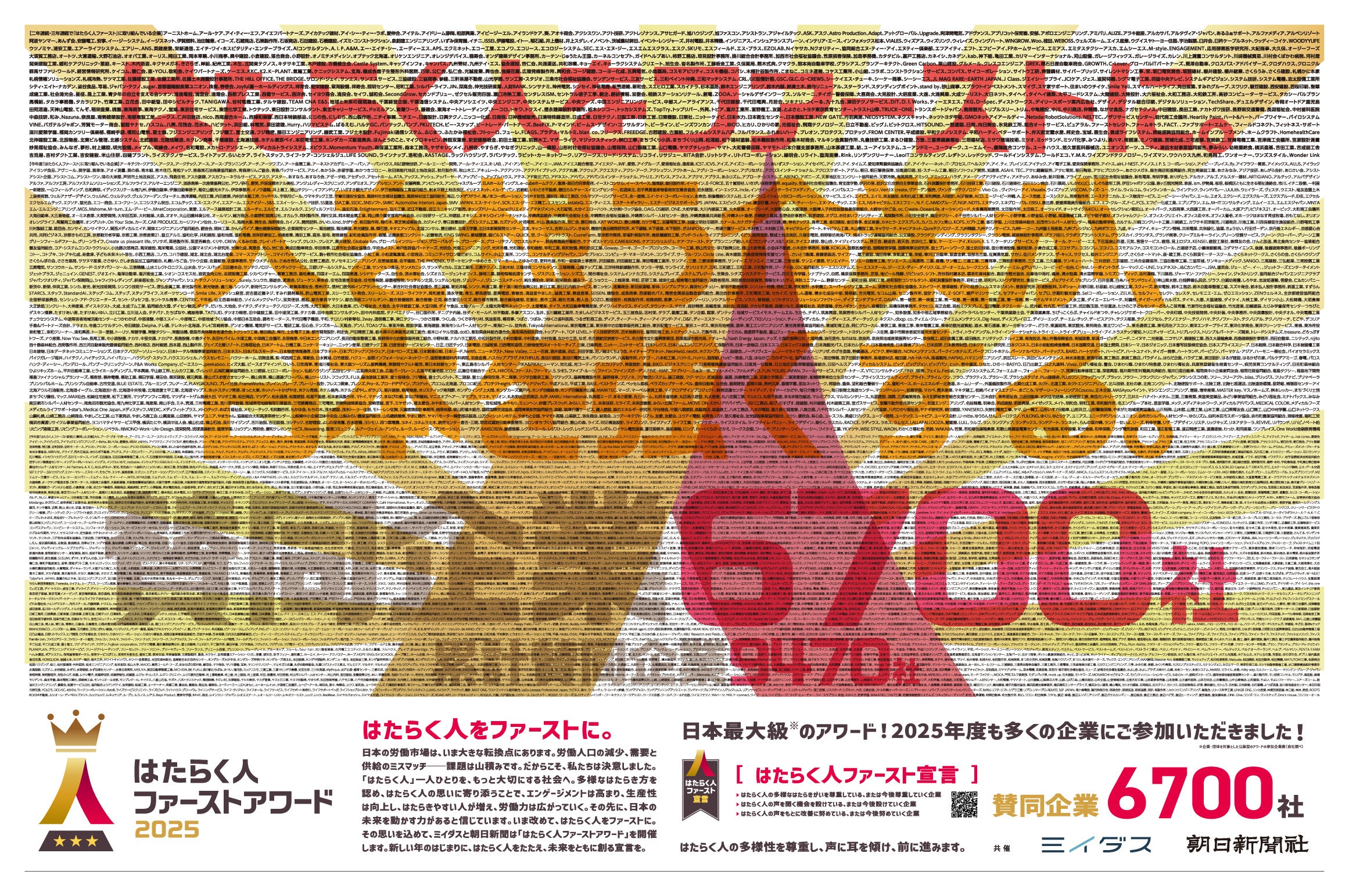 「はたらいて、笑おう。」をビジョンに掲げるパーソルグループのミイダス株式会社(本社:東京都渋谷区、代表取締役社長:後藤 喜悦、以下「当社」)は、株式会社朝日新聞社(代表取締役社長CEO:角田 克)と共催する「はたらく人ファーストアワード2025(以下、本アワード)」の賛同企業6,700社※を記載した広告を朝日新聞朝刊(2026年1月1日付全国版)に掲載しました。