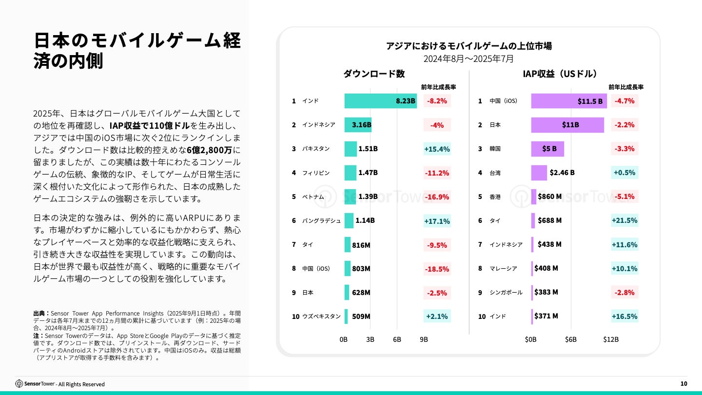 2025年、日本はグローバルモバイルゲーム大国としての地位を再確認し、IAP収益で110億ドルを生み出し、アジアでは中国のiOS市場に次ぐ2位にランクインしました。ダウンロード数は比較的控えめな6億2,800万に留まりましたが、この実績は数十年にわたるコンソールゲームの伝統、象徴的なIP、そしてゲームが日常生活に深く根付いた文化によって形作られた、日本の成熟したゲームエコシステムの強靭さを示しています。