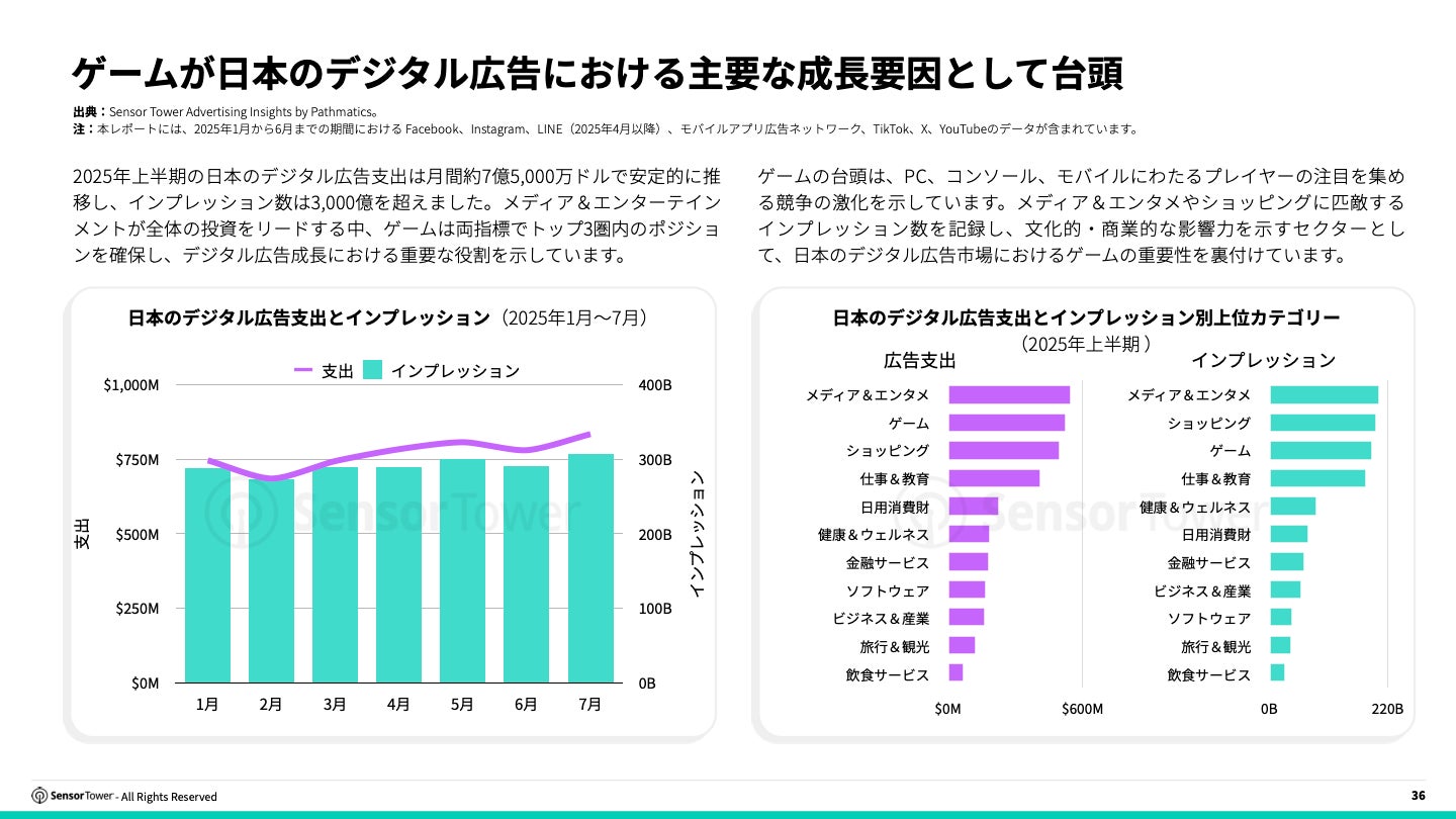 ゲームの台頭は、PC、コンソール、モバイルにわたるプレイヤーの注目を集める競争の激化を示しています。ショッピングやエンターテインメントに匹敵するインプレッション数を記録し、文化的・商業的な影響力を示すセクターとして、日本のデジタル広告市場におけるゲームの重要性を裏付けています。