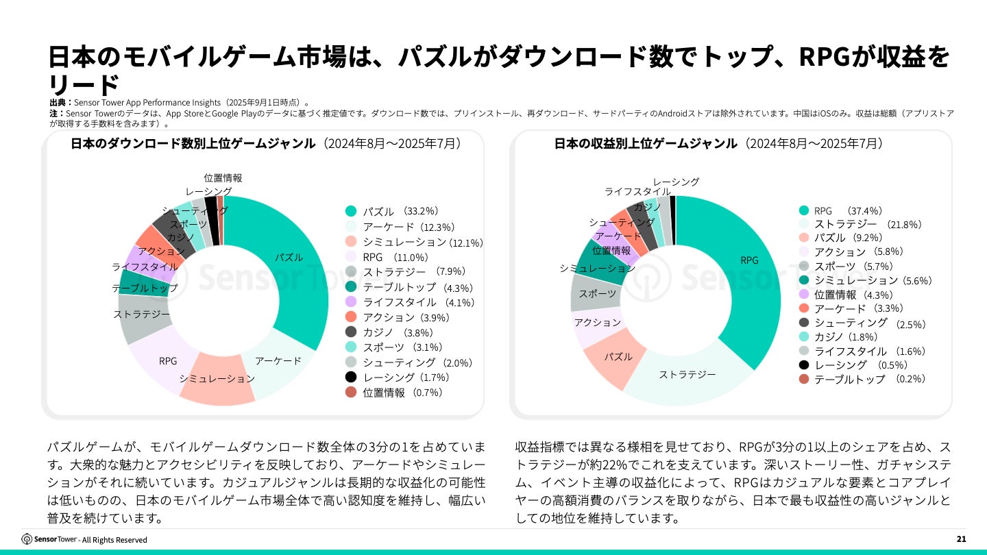 日本のモバイルゲーム市場は、パズルがダウンロード数でトップ、RPGが収益をリード