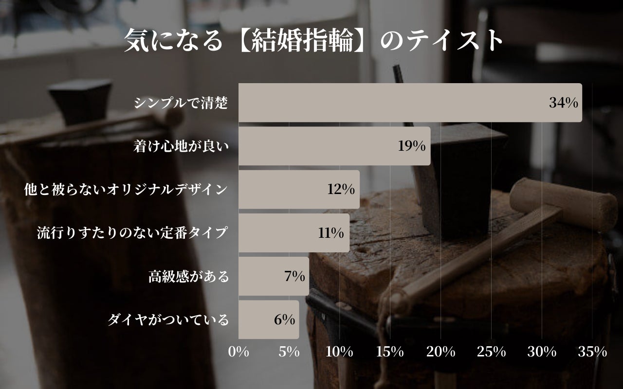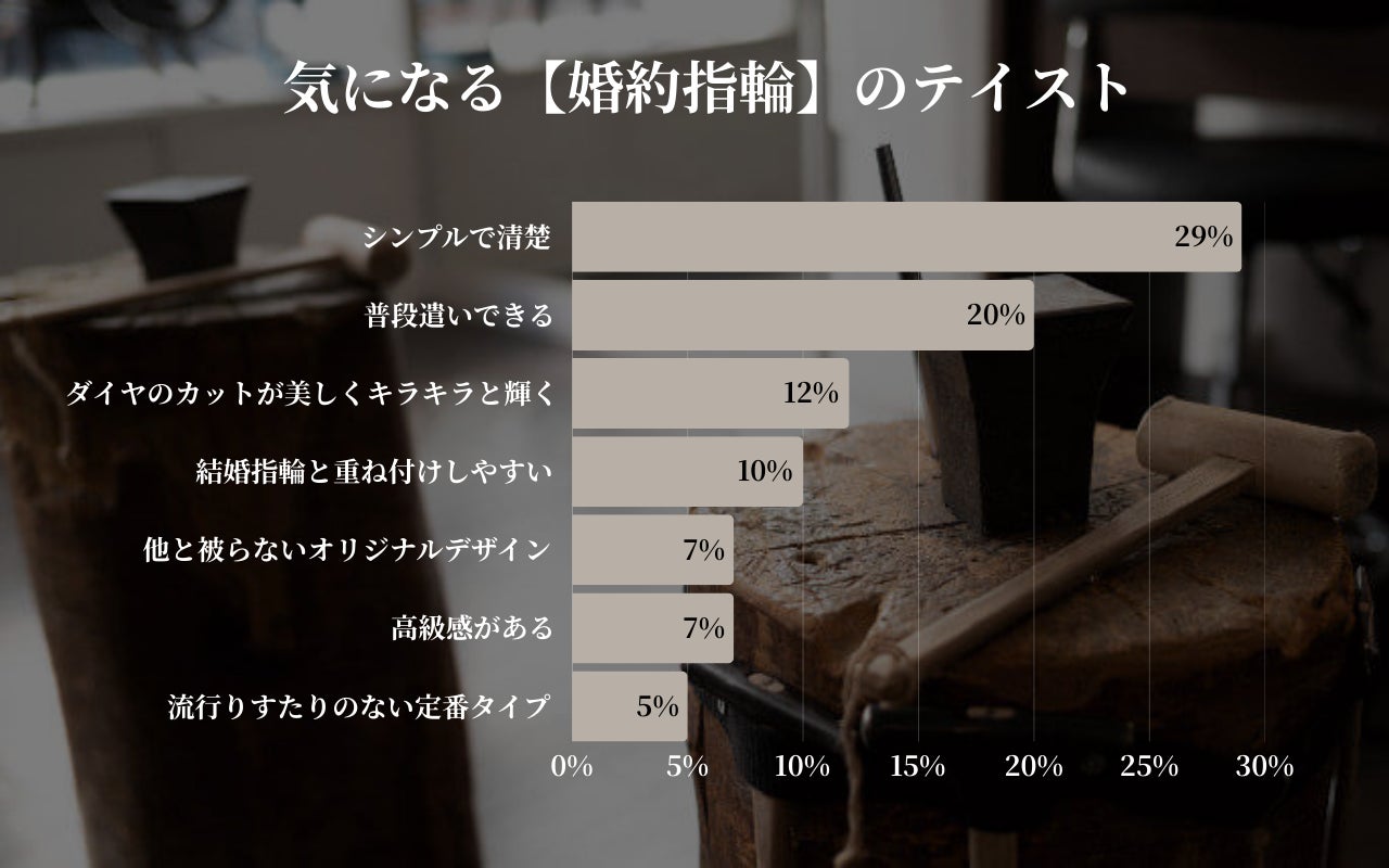 「シンプルで清楚(29%)」と「普段遣いできる(20%)」で全体の約半数を占め、婚約指輪を「日常的に身に着けたい」という実用重視の傾向が鮮明となりました。