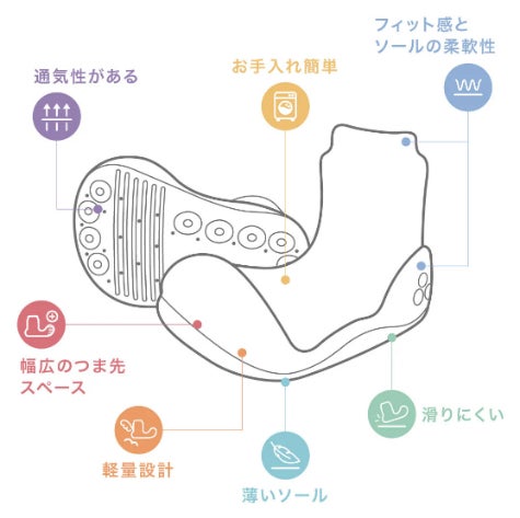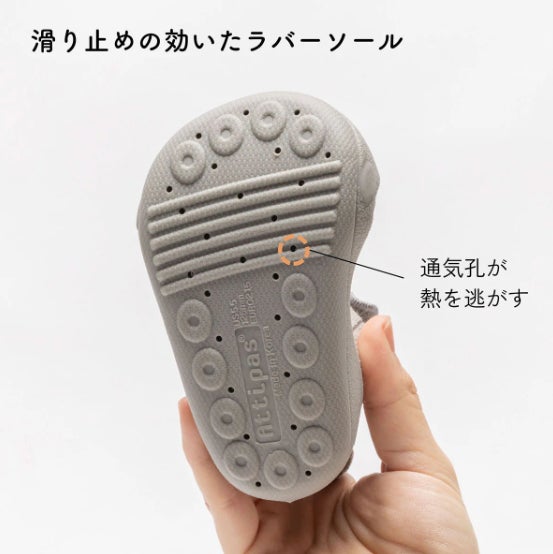 ゴムの底は滑りにくく、熱を逃がすための通気孔も空いており、赤ちゃんが安全で快適に歩くことができます。