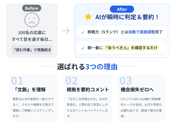 単にスコアリングするだけでなく、「なぜこの評価なのか」という根拠をAIが要約して提示します。「実務経験は短いが、使用技術スタックが募集要項と合致している」といった、人間の目で見落としがちなポイントもハイライトします。