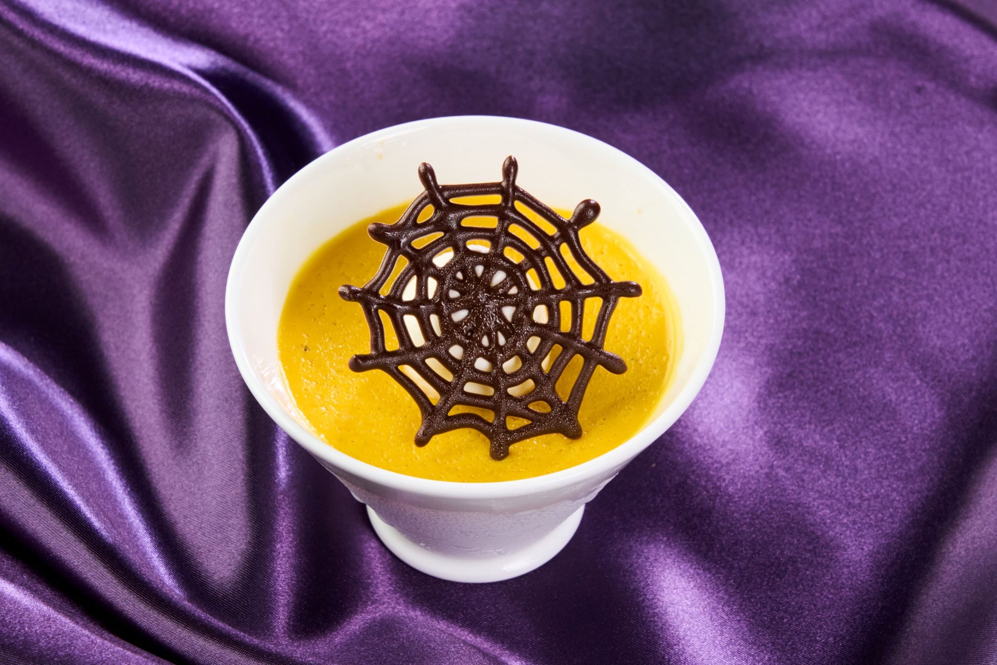 かぼちゃの本来の甘さを活かしたプリンは、濃厚な味わいとなめらかな口当たり。最後に蜘蛛の巣のチョコレートを添えました。
