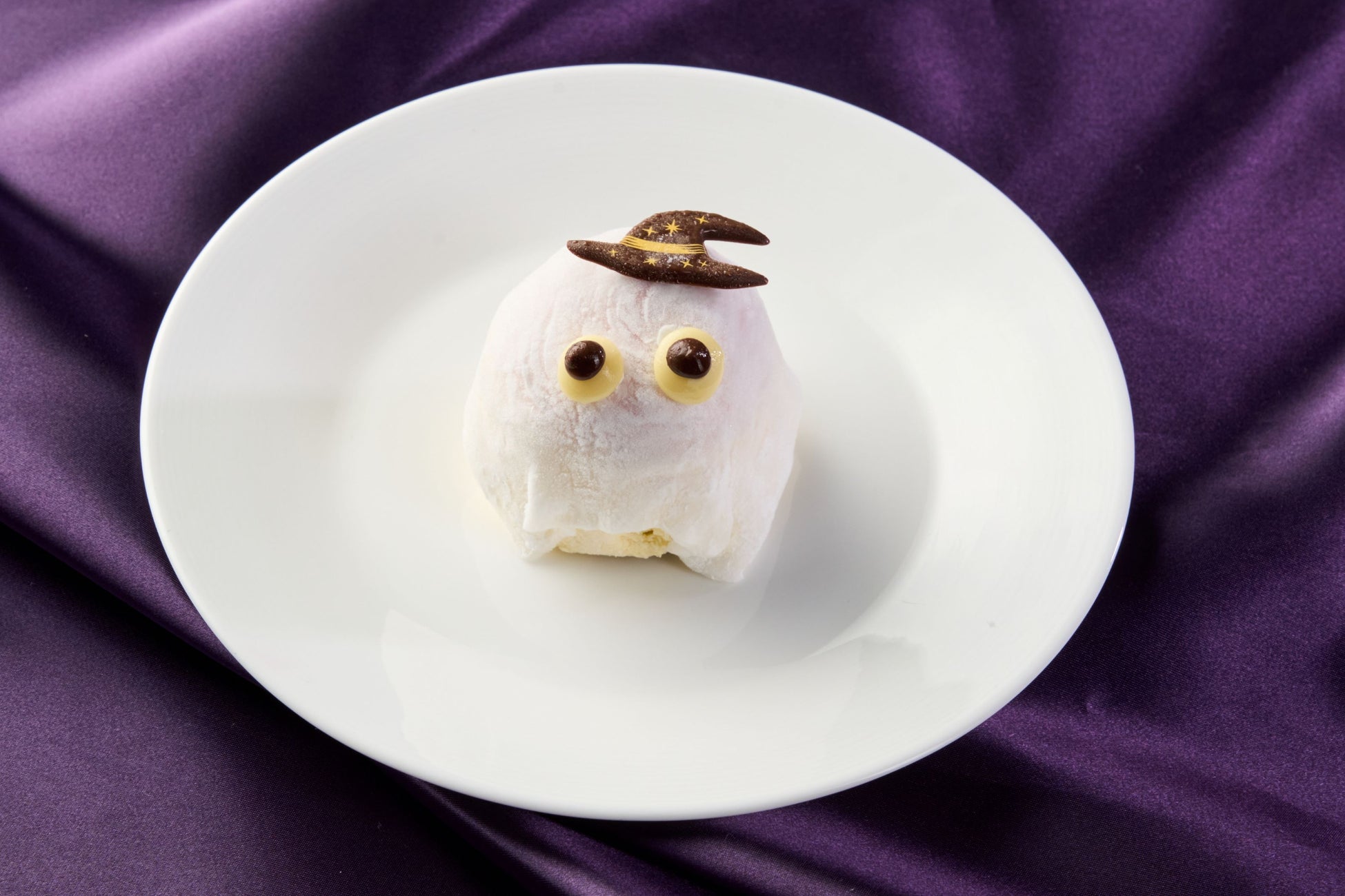 愛らしい見た目のゴーストスイーツ。フランボワーズとショコラのムースをもちもちの求肥で包み、目玉をつけて魔女の帽子をのせました。