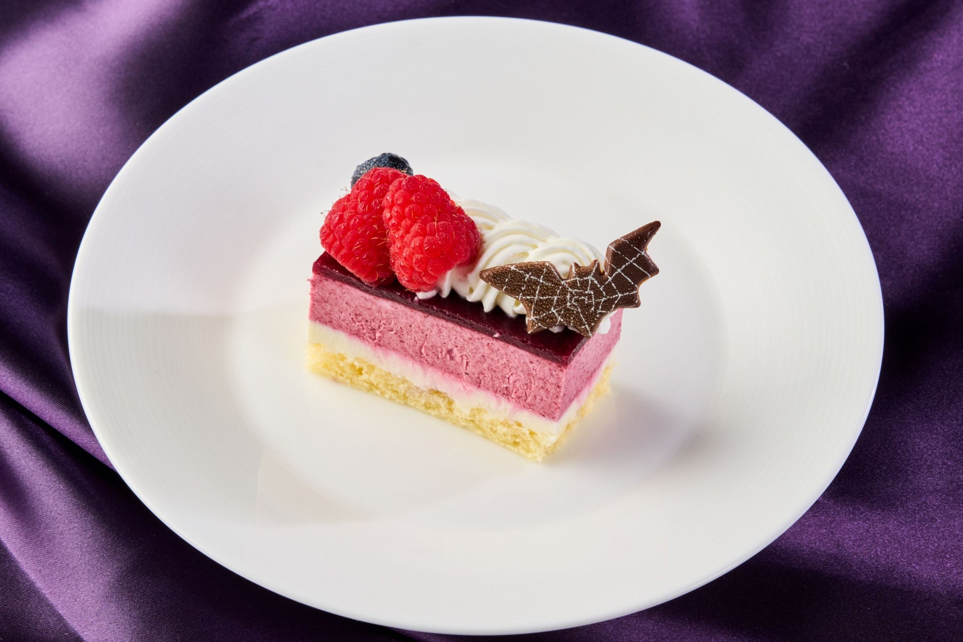 カシスの程よい酸味と口どけの良いショコラブランムースの甘さの絶妙なバランスをお楽しみいただけます。コウモリを添え、ハロウィンらしいビジュアルに仕上げました。