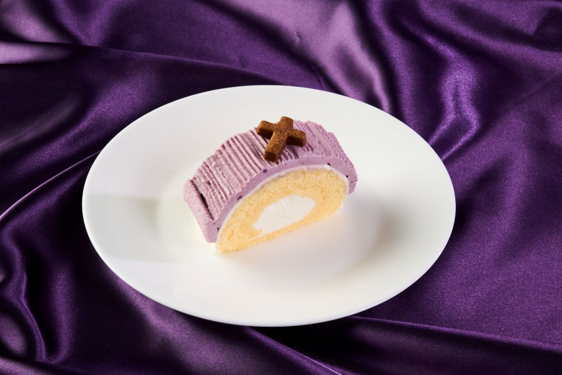 生クリームをふんわりしたロール生地で巻き込んで、しっとりこっくりした、上品な甘さの紫芋クリームで仕上げたロールケーキ。