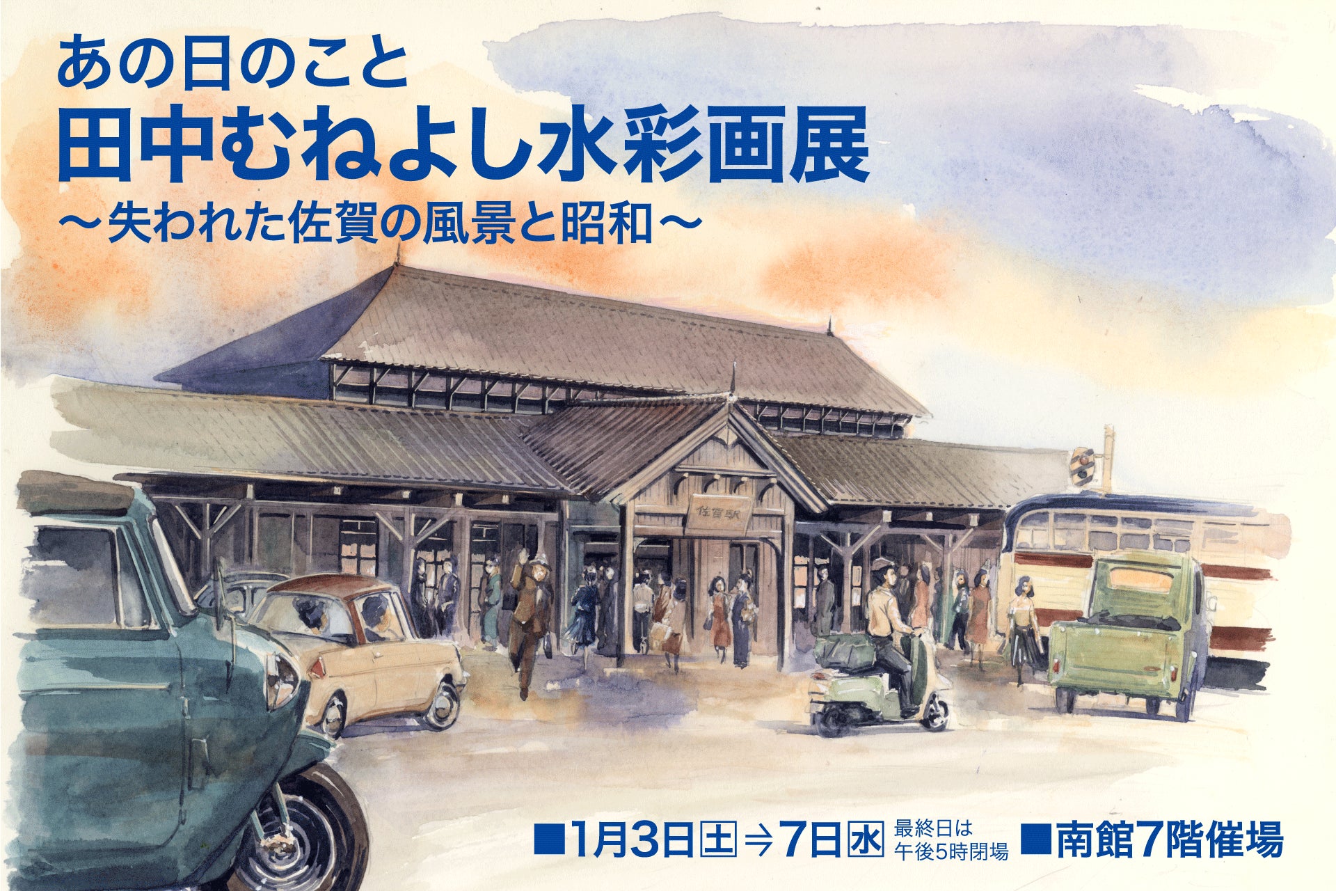 佐賀出身の人気漫画家、田中むねよしによる「佐賀の昭和レトロ」な水彩画原画展。水彩画約30点、図録、カレンダー、ポストカード等を展示・販売いたします。