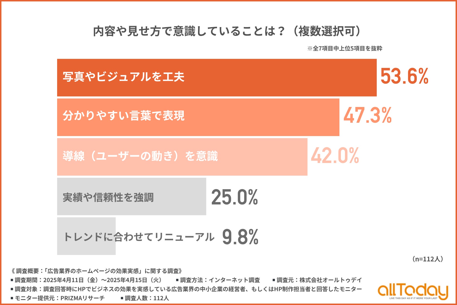 「内容や見せ方で意識していること」について尋ねたところ、『写真やビジュアルを工夫(53.6%)』と回答した方が最も多く、『分かりやすい言葉で表現(47.3%)』『導線(ユーザーの動き)を意識(42.0%)』となりました。