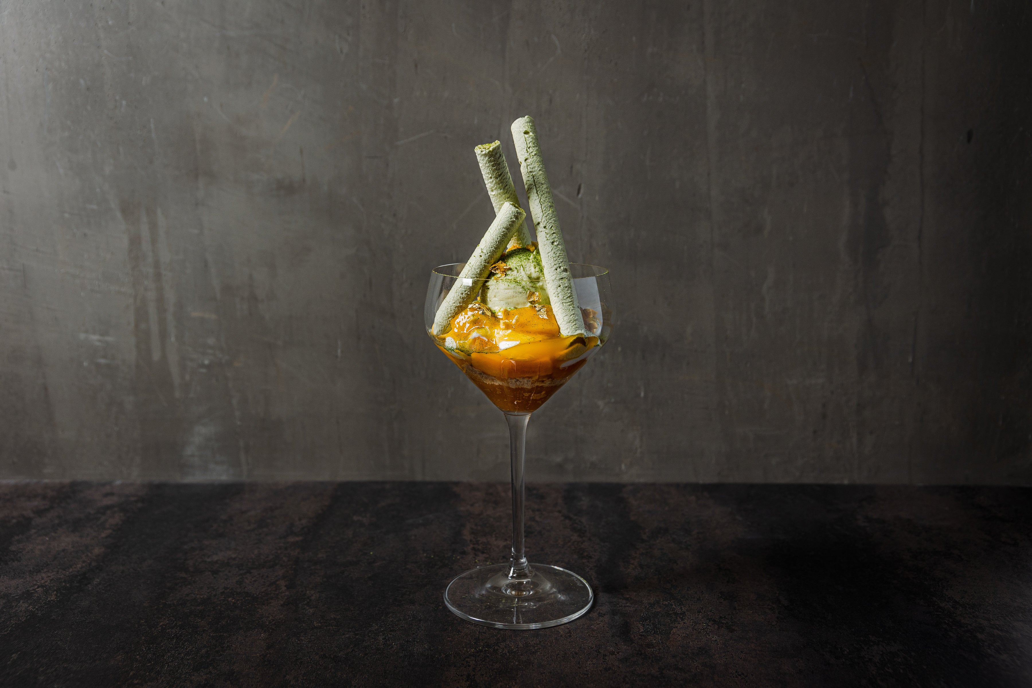 宮崎県産の完熟マンゴーと八女の白折茶を合わせたティラミス仕立てのパフェ。 日本酒飛鸞の貴醸酒とマスカルポーネの相性が美しく、マンゴーの爽やかさとお茶本来の香り高き余韻が清涼感を感じさせる上品かつ侘び寂びな味わいをお楽しみください。