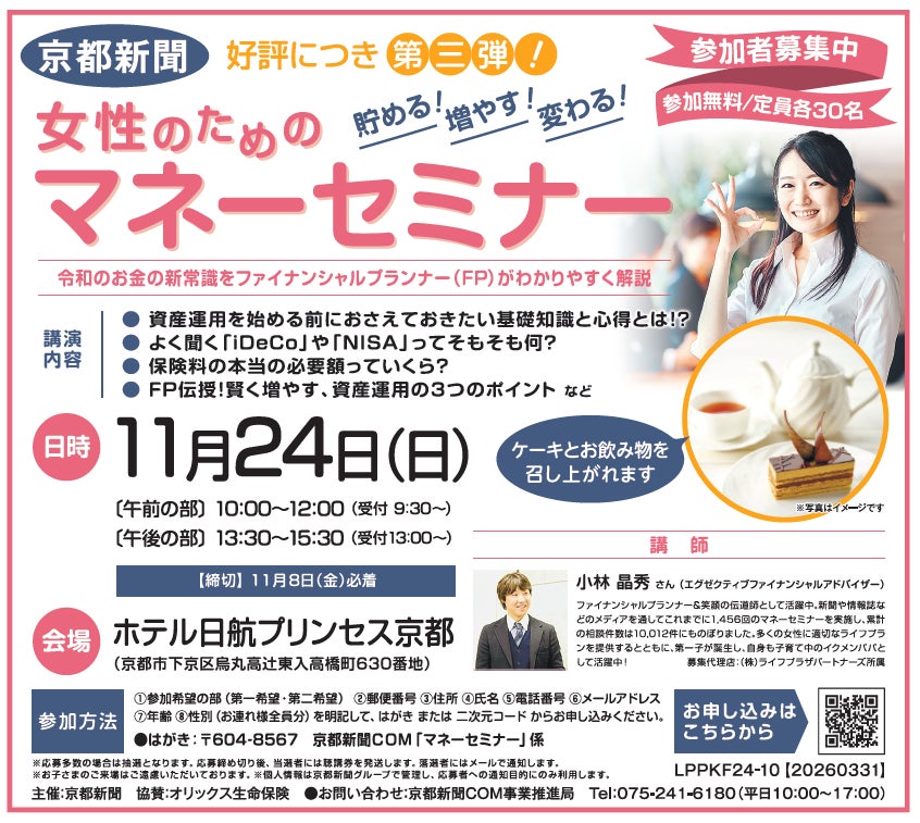 【京都新聞主催】好評につき第三弾!11月24日に女性のためのマネーセミナーを開催! 令和のお金の新常識をファイナンシャルプランナーがわかりやすく解説します