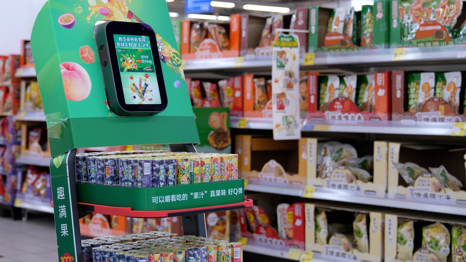 このロボットは、スーパーで自発的に顧客を呼び込み、音声およびディスプレイを駆使して製品を効果的に推奨します。例えば、ロボットが「甘さが足りないと感じている方には、ぜひ『趣満果ソフトキャンディ』をお試しください!」と明るく声をかけることで、顧客の購買意欲を効果的に喚起しています。