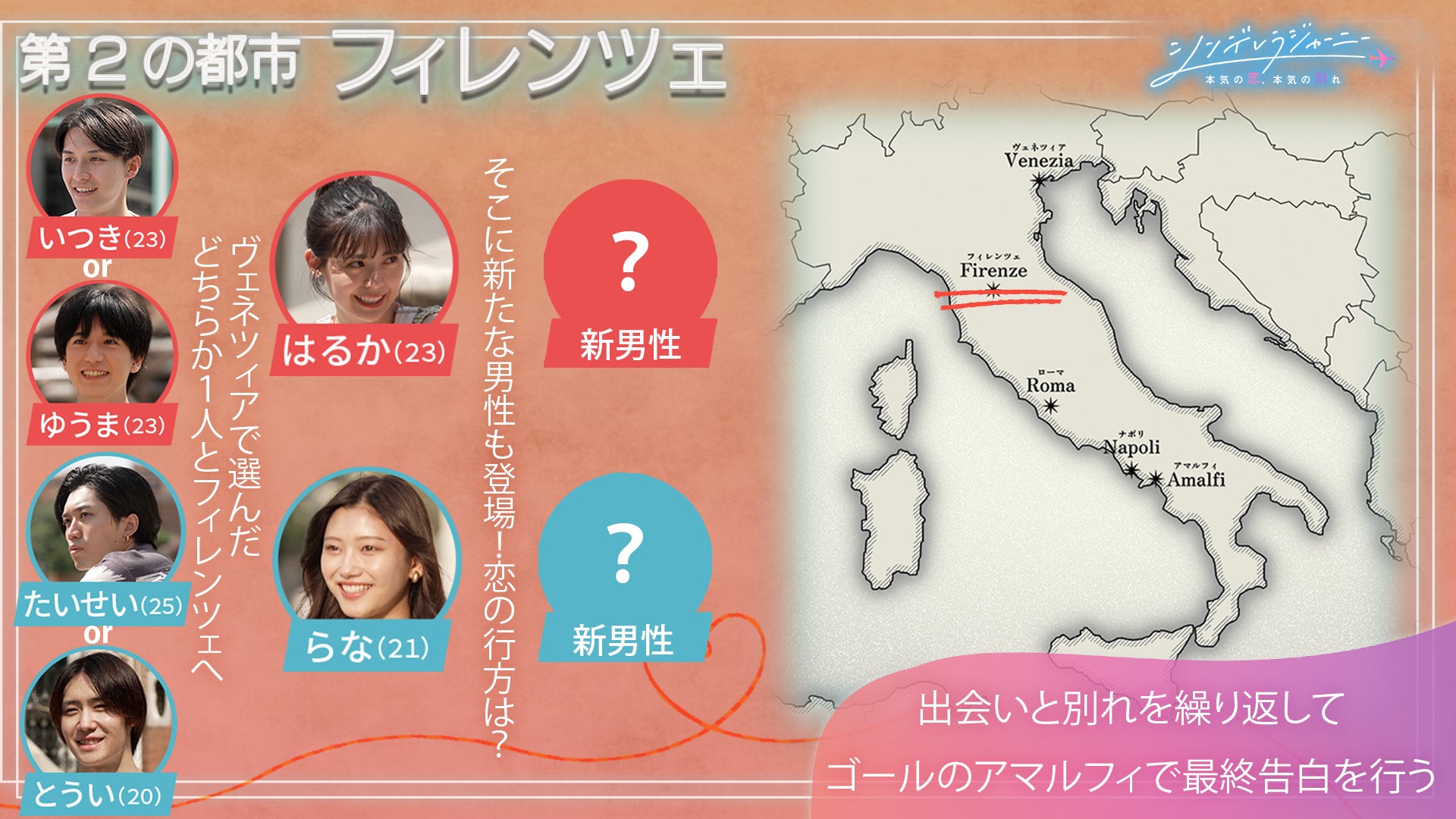 圧倒的映像美の中、イタリアのエキゾチックな街並みで男女14人が繰り広げる「シンデレラジャーニー 〜本気の恋、本気の別れ〜」は、第1話~第3話を無料配信中!まだご覧になっていない方も無料で観始めることができますので、是非お楽しみください。