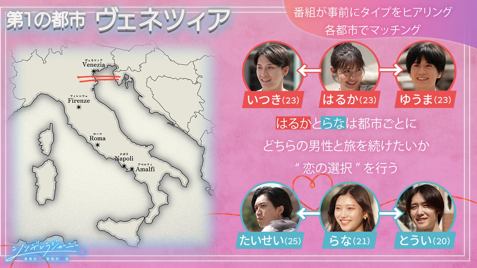 毎週木曜正午より配信開始しているLemino初のオリジナル恋愛リアリティショー「シンデレラジャーニー 〜本気の恋、本気の別れ〜」では、「本気の恋」を探す2人の女性が、イタリアの5つの都市、ヴェネツィア、フィレンツェ、ローマ、ナポリ、アマルフィを旅しながら、12名の男性と出会います。都市を訪れる度に、彼女たちの探し求める魅力的な男性たちとの出会いが待っていますが、次の都市へ一緒に移動できるのは選ばれし男性のみ。言葉も通じない異国の地で、男女がお互いの心を通わせながら、運命の人を探し求める旅に出かけます。