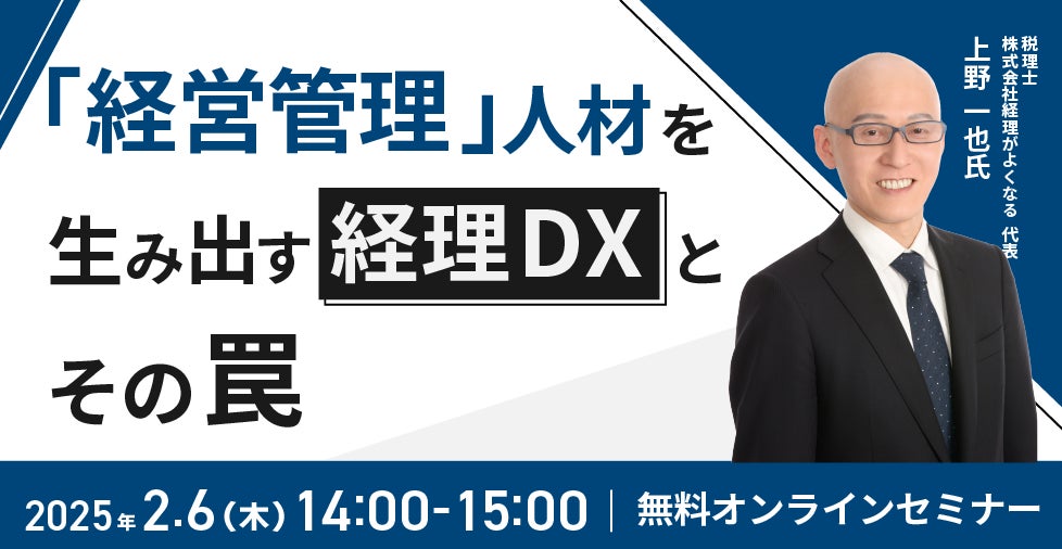 そこで本セミナーでは経理のデジタル化による業務効率化に関する書籍を複数出版し、自身も経理システムの改善を行ってきた 税理士・(株)経理がよくなる 代表である上野 一也氏をお招きし、経理DXの専門家が経理業務のデジタル化の進め方から事例、そして経理DXを通じた人材までを徹底解説していただきます。
