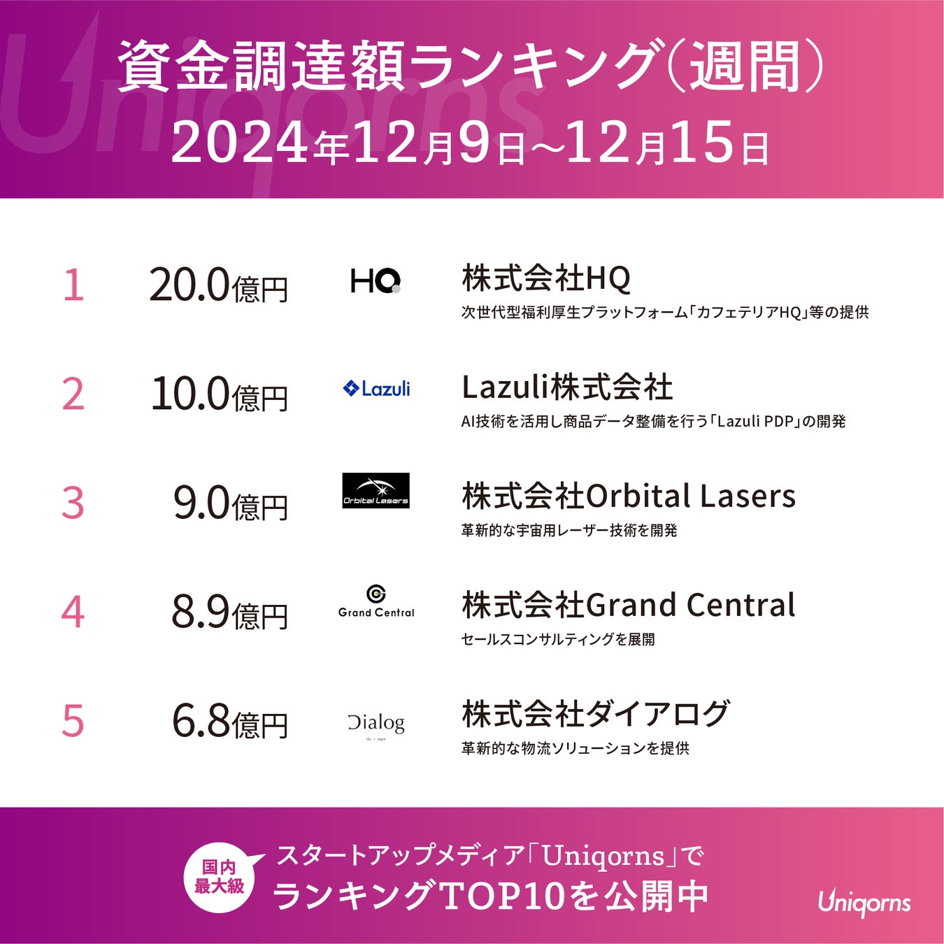 国内最大級のスタートアップメディア「Uniqorns(ユニコーンズ)」(運営:株式会社エモリューションクリエイティブ 本社:福岡市、代表取締役:松石 圭介)が発表した2024年12月第2週の資金調達額ランキングで、次世代型福利厚生プラットフォーム「カフェテリアHQ」やリモートワーク支援プラットフォーム「リモートHQ」を展開する株式会社HQが20億円の大型資金調達を実施し、首位に立ちました。2位にはAI活用の商品データ整備ソリューション「Lazuli PDP」を提供するLazuli株式会社が10億円、3位には宇宙用レーザー技術開発のOrbital Lasers社が9億円の調達を実施するなど、多様な分野で資金調達が活発化しています。