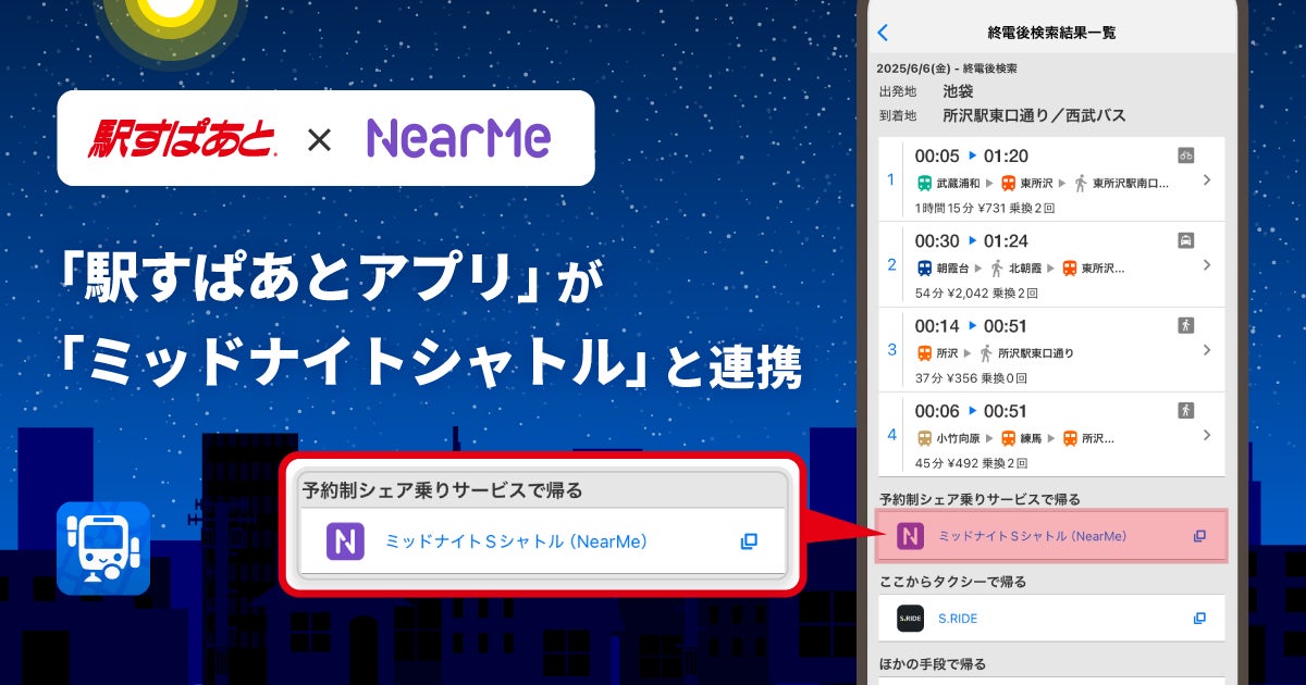 経路検索サービス「駅すぱあと」を提供する株式会社ヴァル研究所(本社:東京都杉並区、代表取締役:菊池 宗史)は、iOS版アプリ「駅すぱあと for iPhone」(以下「駅すぱあとアプリ」)にて、株式会社NearMe(本社:東京都中央区、代表取締役社長:髙原 幸一郎、以下:ニアミー)が運行する「ミッドナイトシャトル」との連携を、2025年6月6日(金)より開始しました。