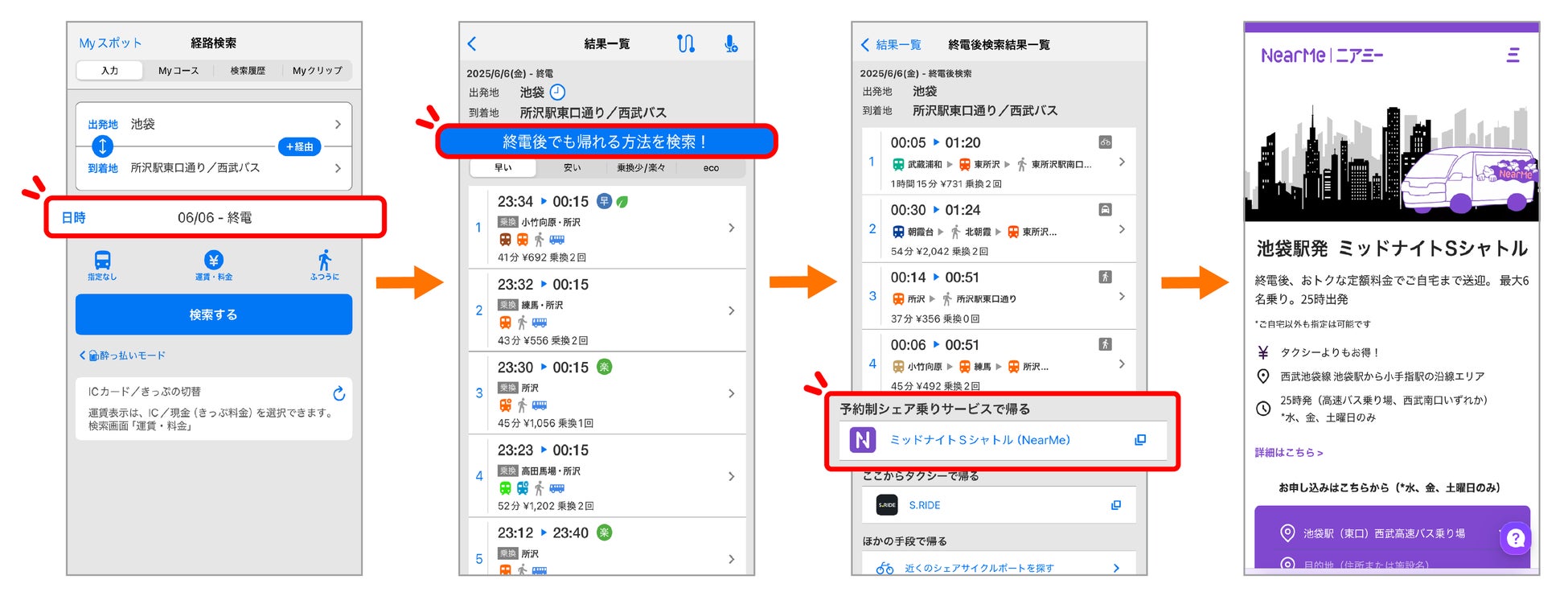 沿線地域の移動課題が顕在化している終電時間帯や交通手段の供給が不足しているエリアにおいて、地域特性やユーザー動向、需要などを検証するため、ニアミーがJTOS各社の持つエリアの沿線で実証運行をしています。実証運行の第一弾となる「ミッドナイトSシャトル」は、終電後となる25時より池袋線西武南口を発車し、西武池袋線沿いに小手指駅付近までの範囲で運行しており、第二弾の「ミッドナイトシャトル三鷹」は、24時よりJR三鷹駅から西方向および南方向のエリアの範囲で運行しています。