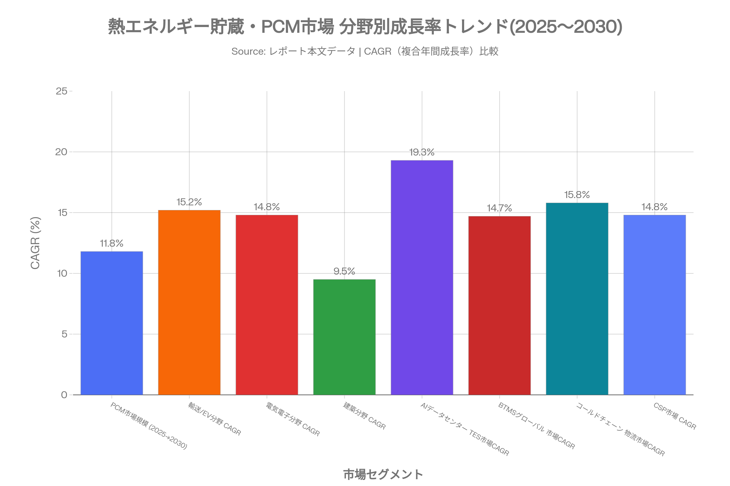世界PCM市場は2025年時点で約72億米ドルと推定され、2030年までに140億米ドル超への拡大が見込まれる(CAGR約11.8%)