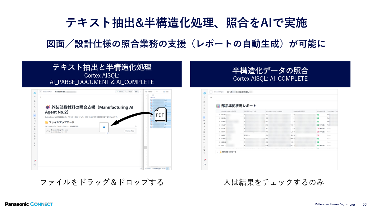 一つ目は「お客様満足度調査の高度化」です。年1回実施する調査において、膨大な自由記述コメントの要約とカテゴリ分類にSnowflakeとCortex AI、Streamlitを活用。これにより従来は手作業で行っていた主観的な分析を自動化・客観化し、約200時間かかっていた作業時間を約20時間へと、90%の削減に成功しました。二つ目は「図面・設計仕様の照合業務の高度化」です。製品図面と部品図面の照合業務においてAIエージェントを導入し、PDF等の非構造化データをドラッグ&ドロップするだけでテキスト抽出と構造化を実現。ワードマッチングと大規模言語モデル(LLM)によるAI照合を組み合わせた半自動化により、作業時間を80%〜97%削減しました。渡邉氏は「作業の省力化だけでなく、人的ミスによる製品回収やブランド毀損といった経営リスクの低減にもつながる」と、その効果を強調しました。
