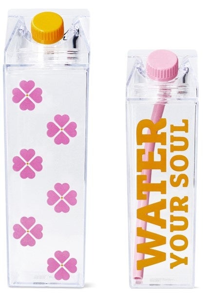 牛乳パック型で冷蔵庫にすっぽり収まるボトル。右はストロー付