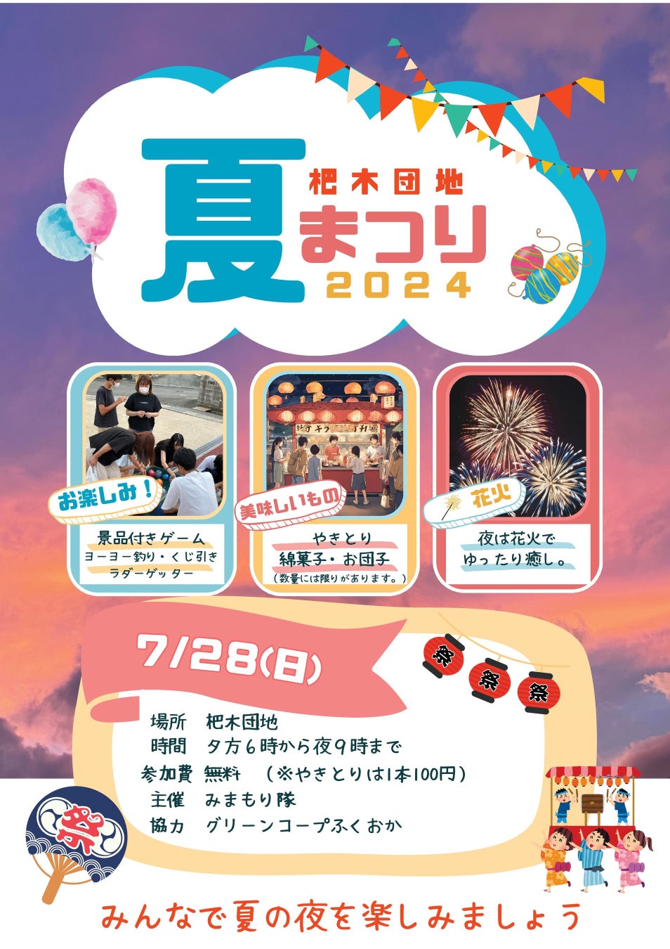 当日は、綿菓子やかき氷、お団子が振る舞われます。グリーンコープ生協ふくおかは、焼き鳥をその場で焼いて販売します。さらに、お楽しみ景品付き企画として、ヨーヨー釣りやくじ引き、夜は子どもから大人まで楽しめるように手持ち花火を準備しています。