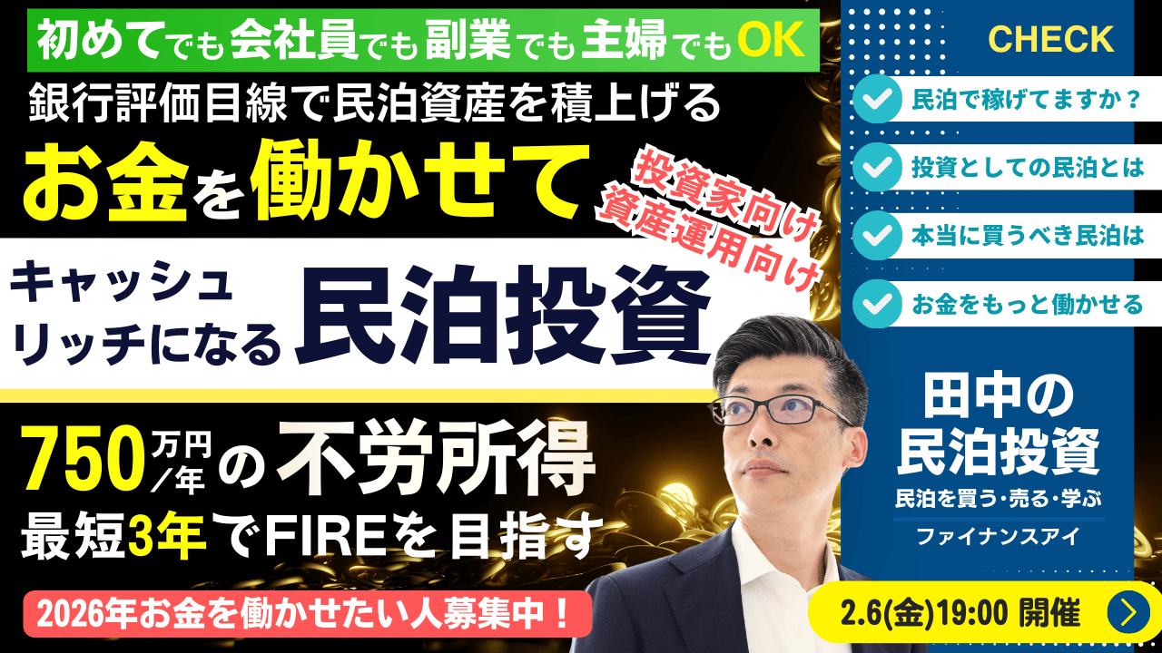 株式会社ファイナンスアイ(本社:大阪府、代表取締役:田中琢郎)は、すでに収益を生んでいる民泊事業を事業資産として購入する『民泊M&A投資』と日本政策金融公庫の創業融資(連帯保証無し・無担保)などの事業融資を活用した『会社員の副業や公務員でも、お金を働かせて最短3年で年間750万円の不労所得を目指せる、銀行評価目線の収益化済み稼げる民泊投資×融資活用による資産形成セミナー(オンラインZOOM/大阪会場の同時開催)』を、2026年2月12日(木)19時に開催します。