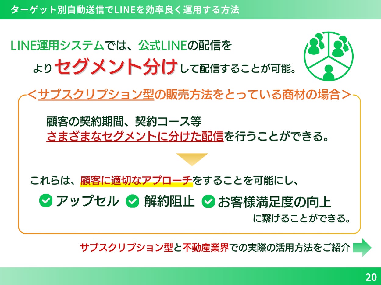また、LINE運用システムでは、より詳細にセグメント分けした公式LINEからの自動メッセージ配信が可能です。例えば、サブスクリプション型商材の場合、顧客の契約期間、契約コース等さまざまなセグメントに分けた配信を定常送信することもできます。これらは、顧客毎の適切なアプローチを可能にし、アップセルや解約阻止、お客様満足度の向上に寄与します。
