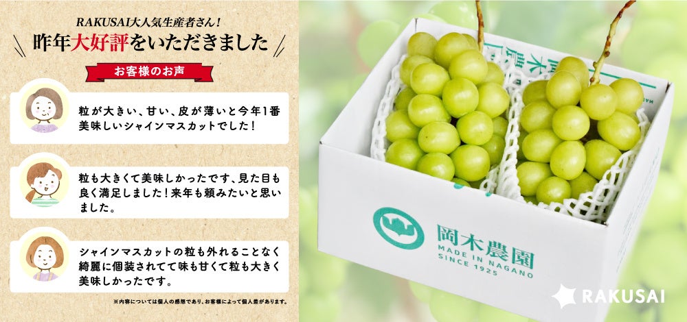 楽彩株式会社(本社:東京都足立区/代表取締役社長:大﨑善保)は、長野県にある岡木農園が丹精込めて育てた「至高のシャインマスカット」を、2025年9月1日(月)10:00より公式オンラインショップにて販売開始いたします。